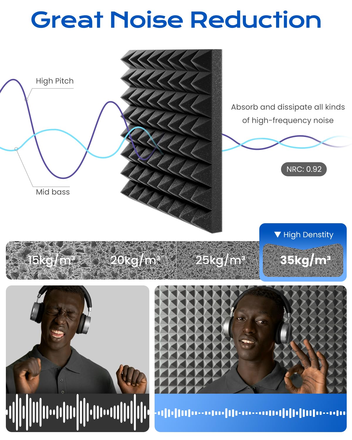 👍【Professional Acoustic Treatment】Sonicism sound proof foam panels for walls adopt a novel pyramid 3D design and high-density polymer material. The contact area between the acoustic foam panels and the sound wave is increased, which can effectively reduce flutter echo, reverberation, standing wave and high-frequency noise. In bringing you a quiet and comfortable environment, it can also improve the purity of vocal music.