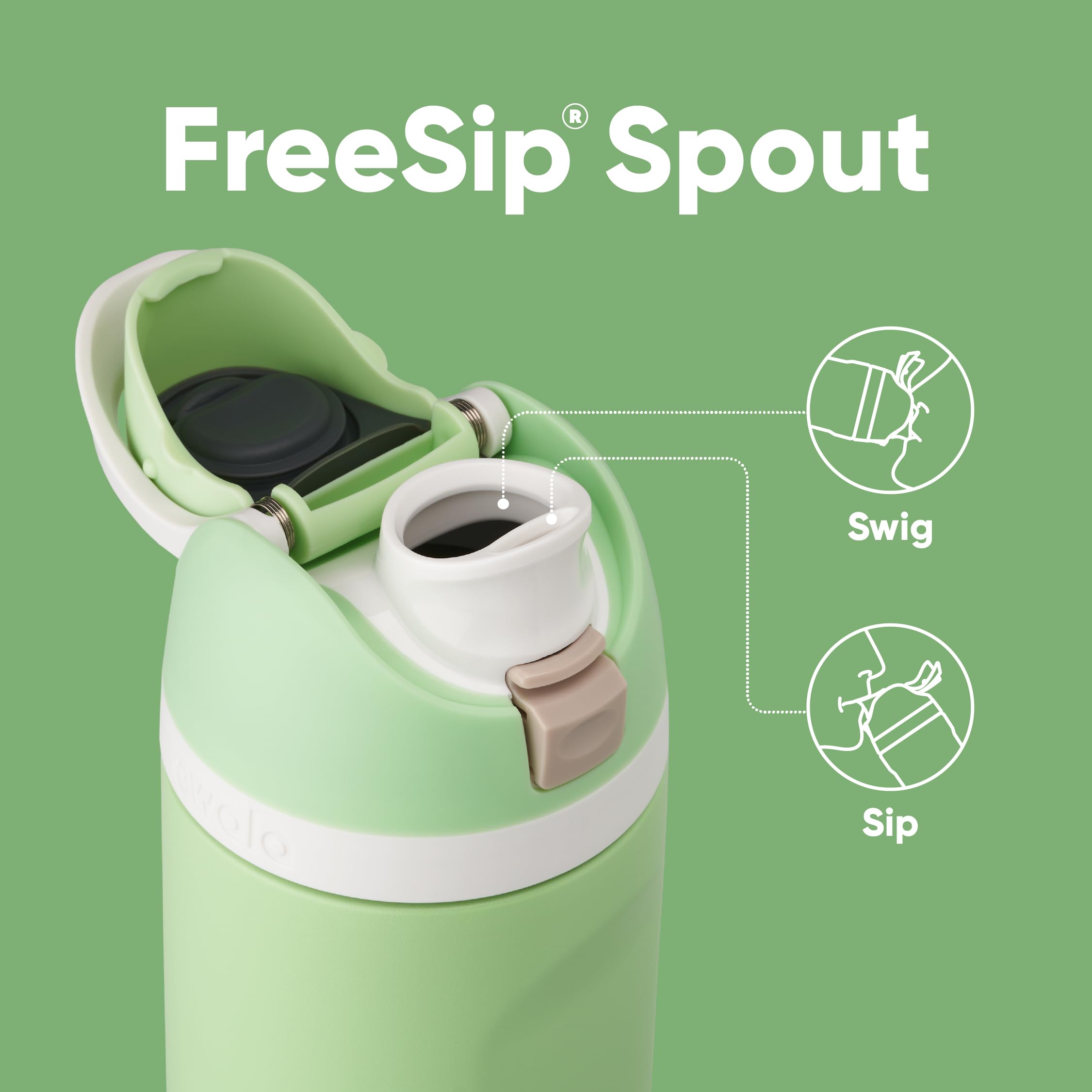 Patented FreeSip spout designed for either sipping upright through the built-in straw or tilting back to swig from the spout opening