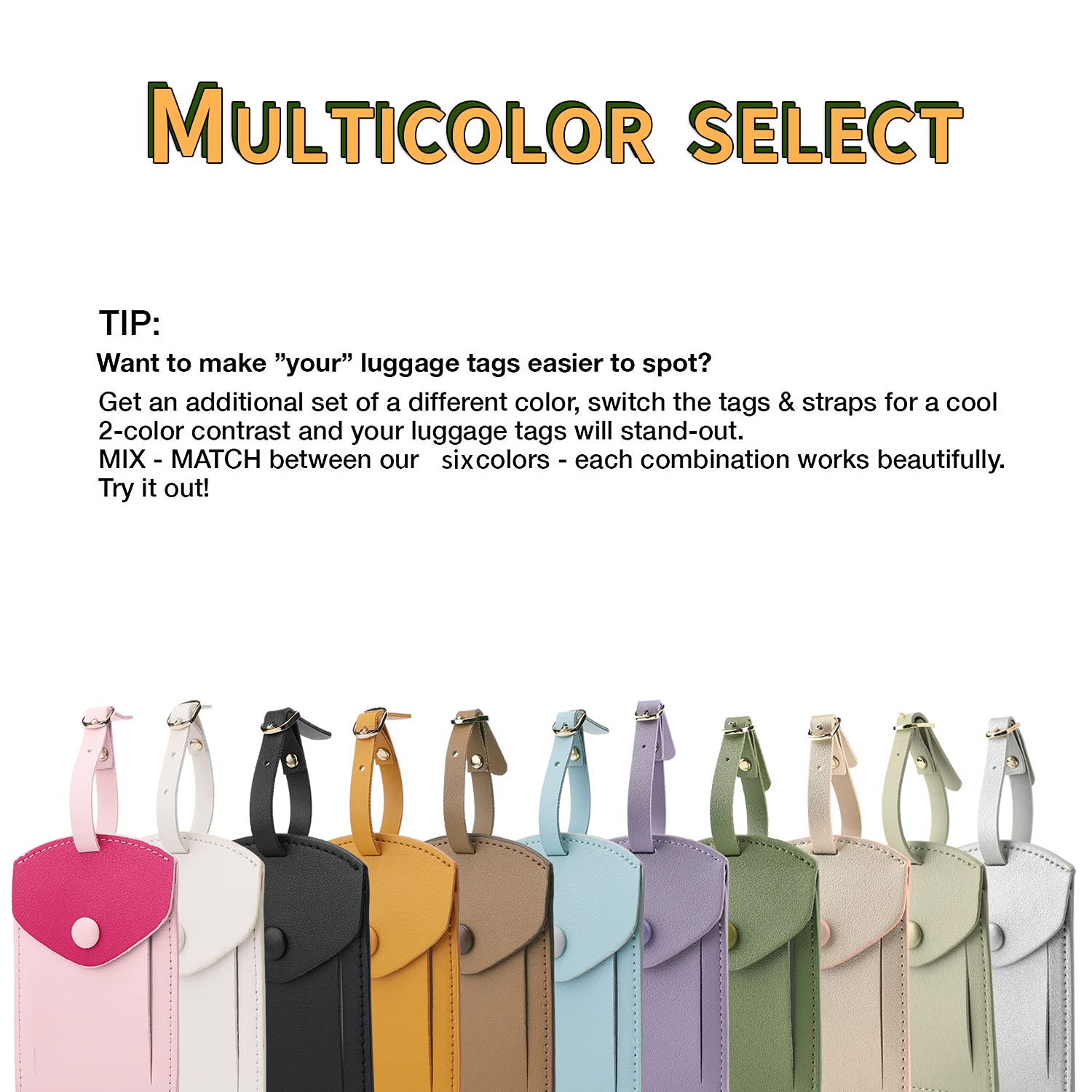 1.EXCELLENT MATERIAL QUALITY - Crafted from superior soft synthetic leather, no smell, environmental. Nice sewing and reinforced stitching. Comfortable touch feeling and durable for trips. The length of the strap can be adjusted, extended to make it easier to attache tags to the big items. The buckle is made of 304 stainless steel and extremely durable.Personalized tags come from the design of independent designers.