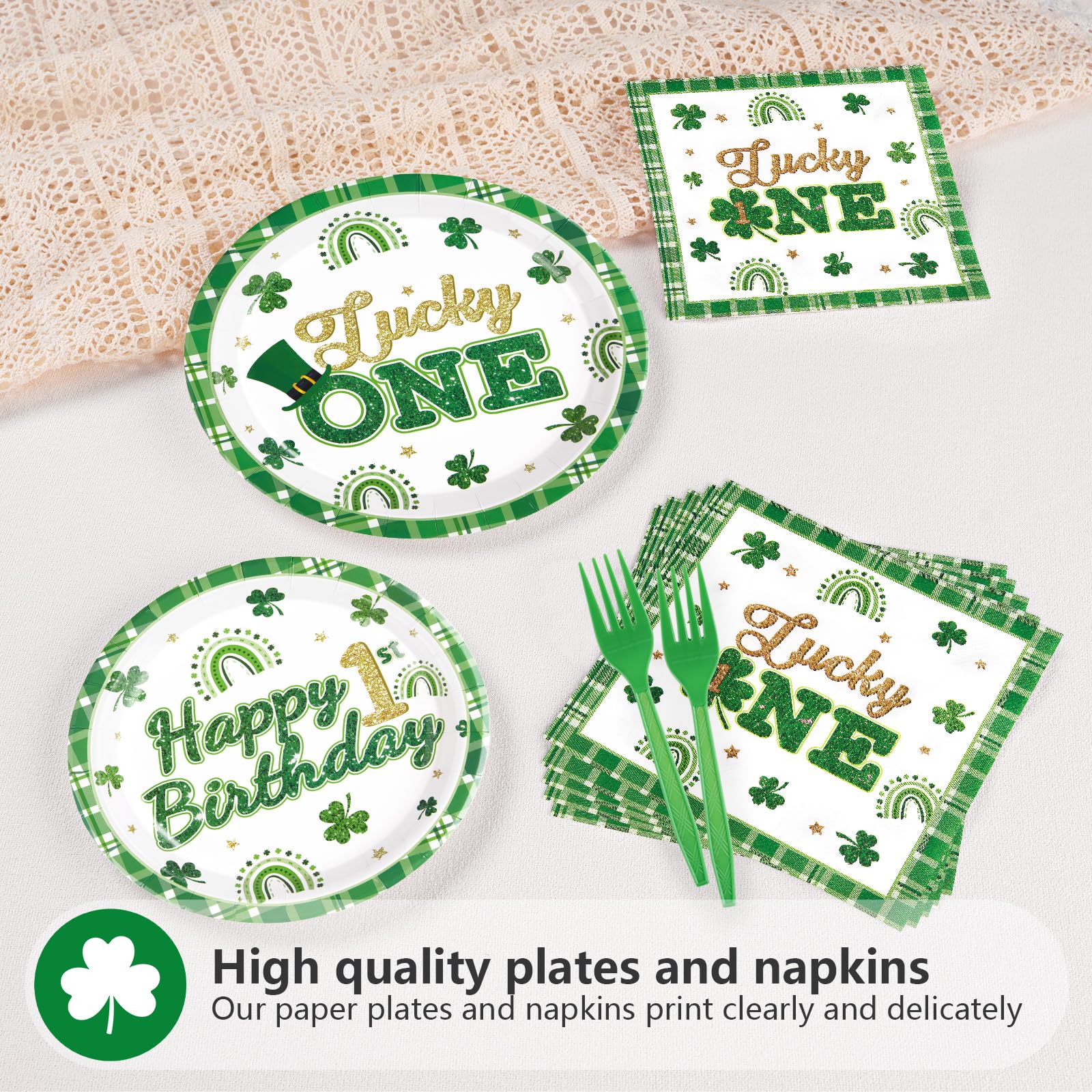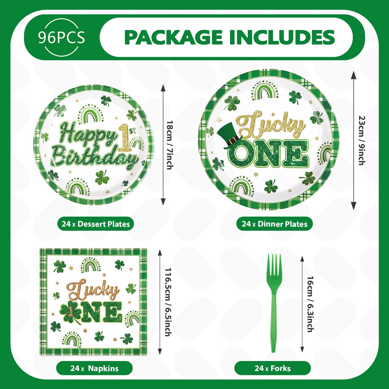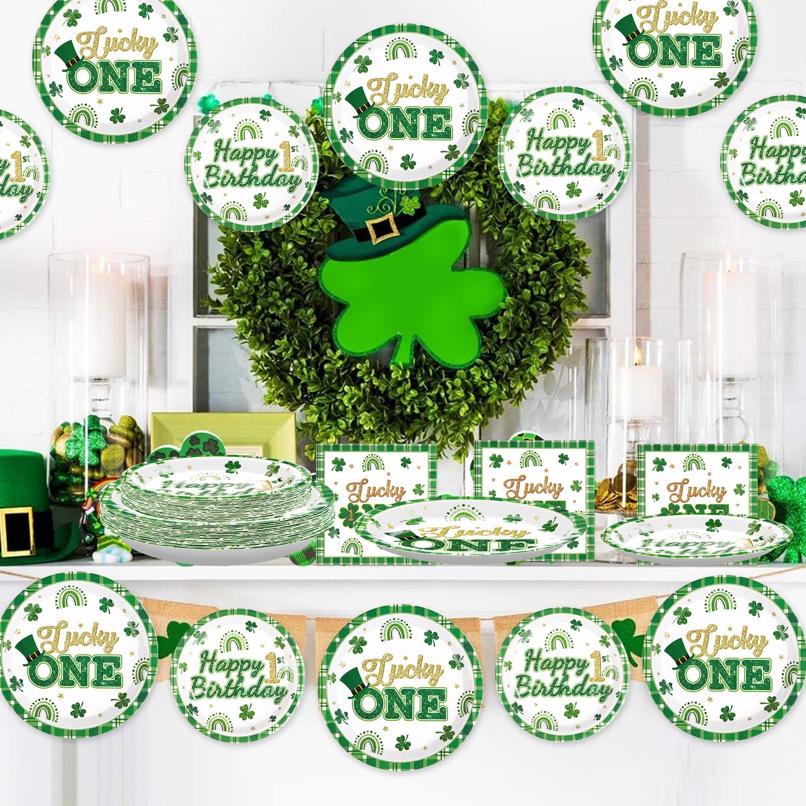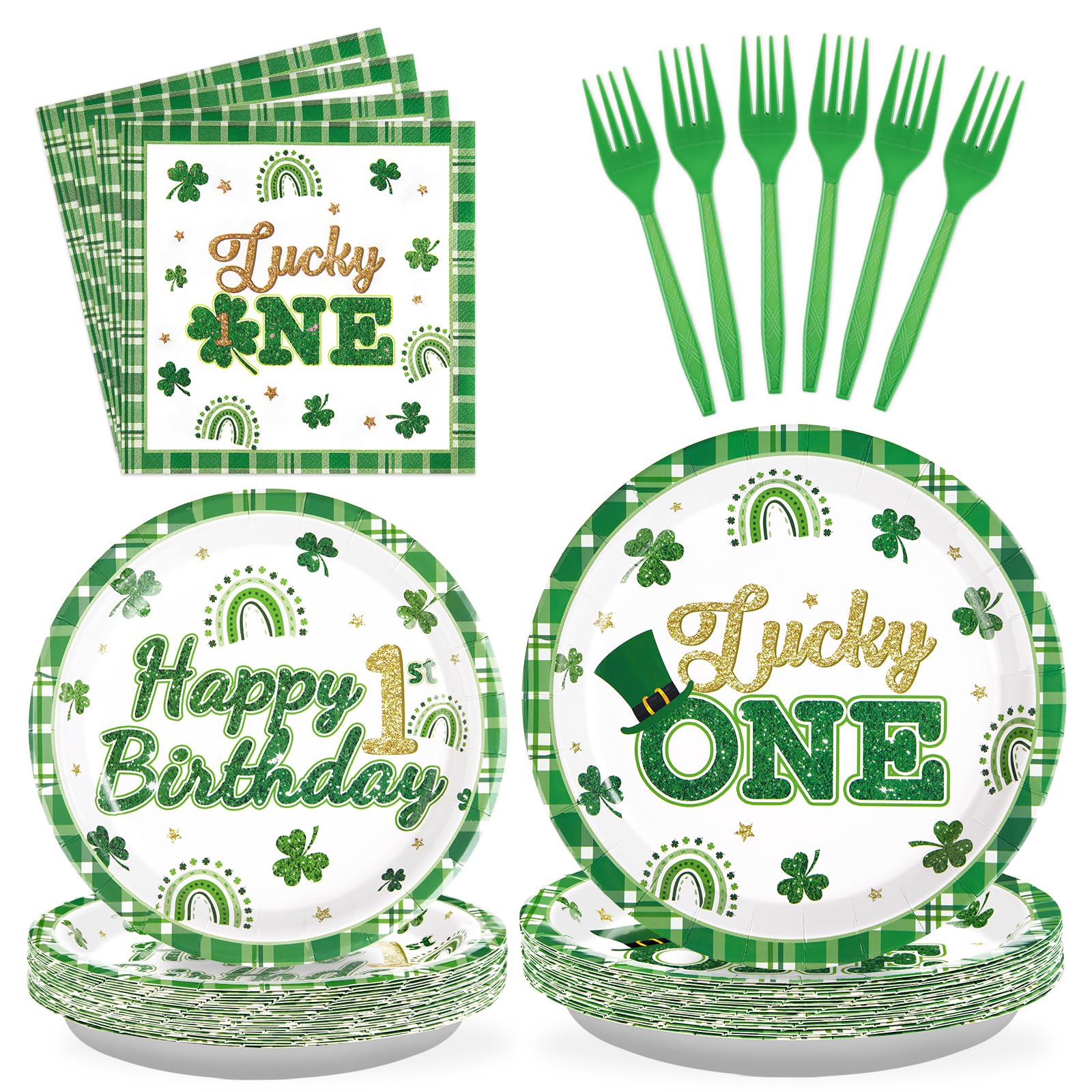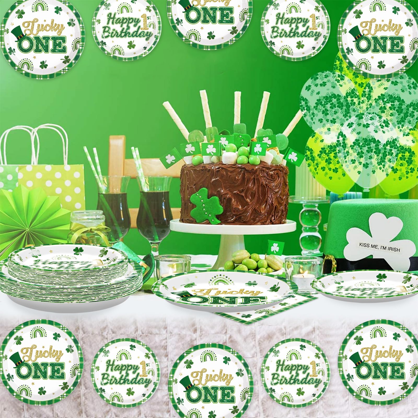 Lucky One 1st Birthday Party Decorations: Our lucky one 1st birthday dinnerware set included 24pcs 9'' lucky one 1st birthday plates, 24pcs 7'' st. patrick's day birthday plates, 24pcs paper napkins. Using st. patrick's day 1st birthday party decorations will make your party more enjoyable