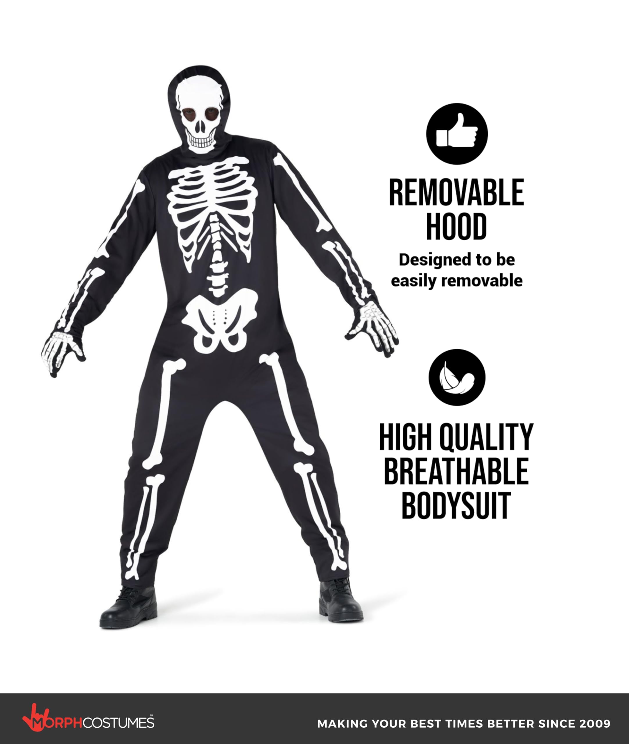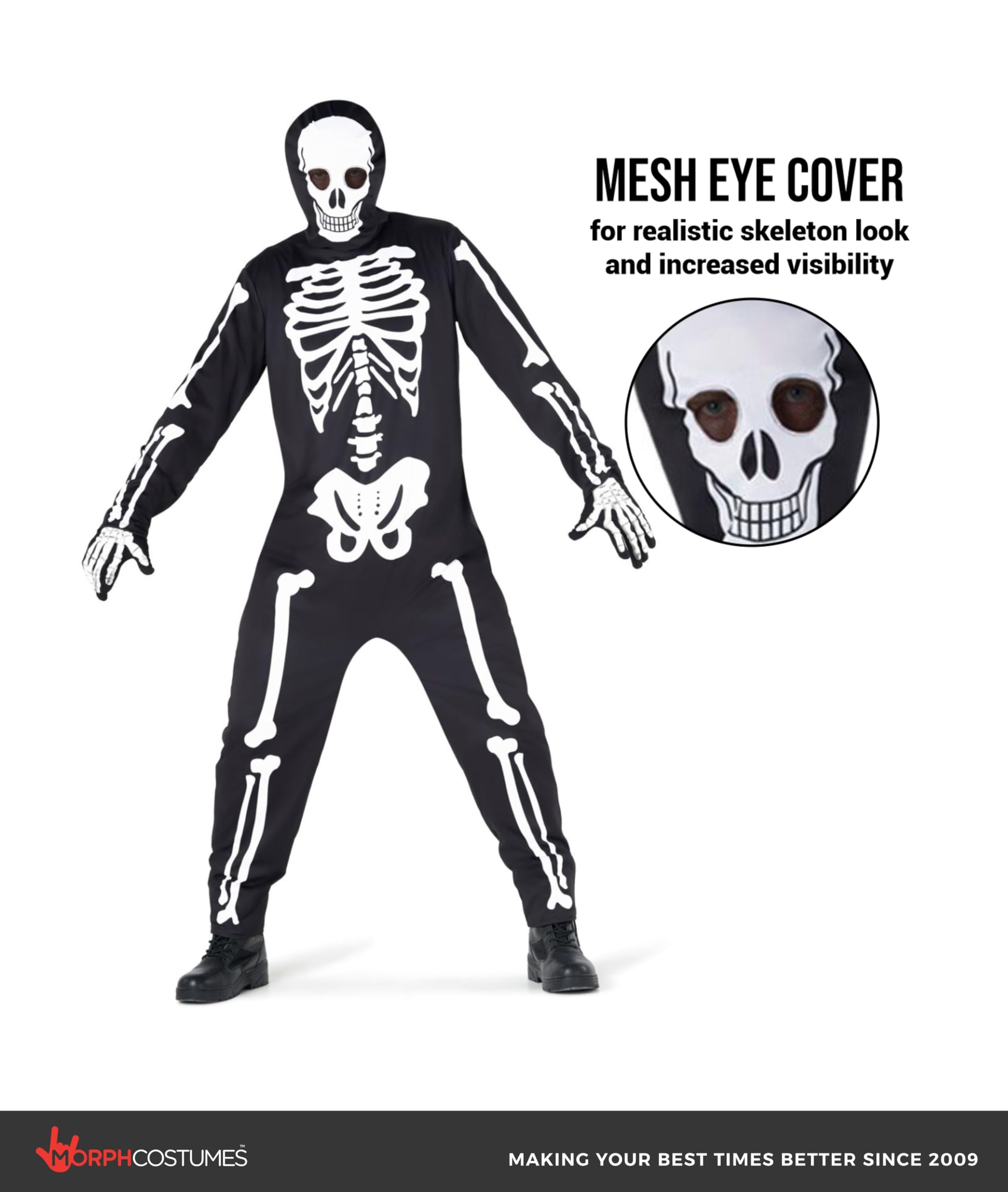 Complete skeleton suit adults: Includes a detailed black skeleton jumpsuit and removable hood with mesh eye panels for visibility—perfect for achieving a classic Halloween skeleton costume look.