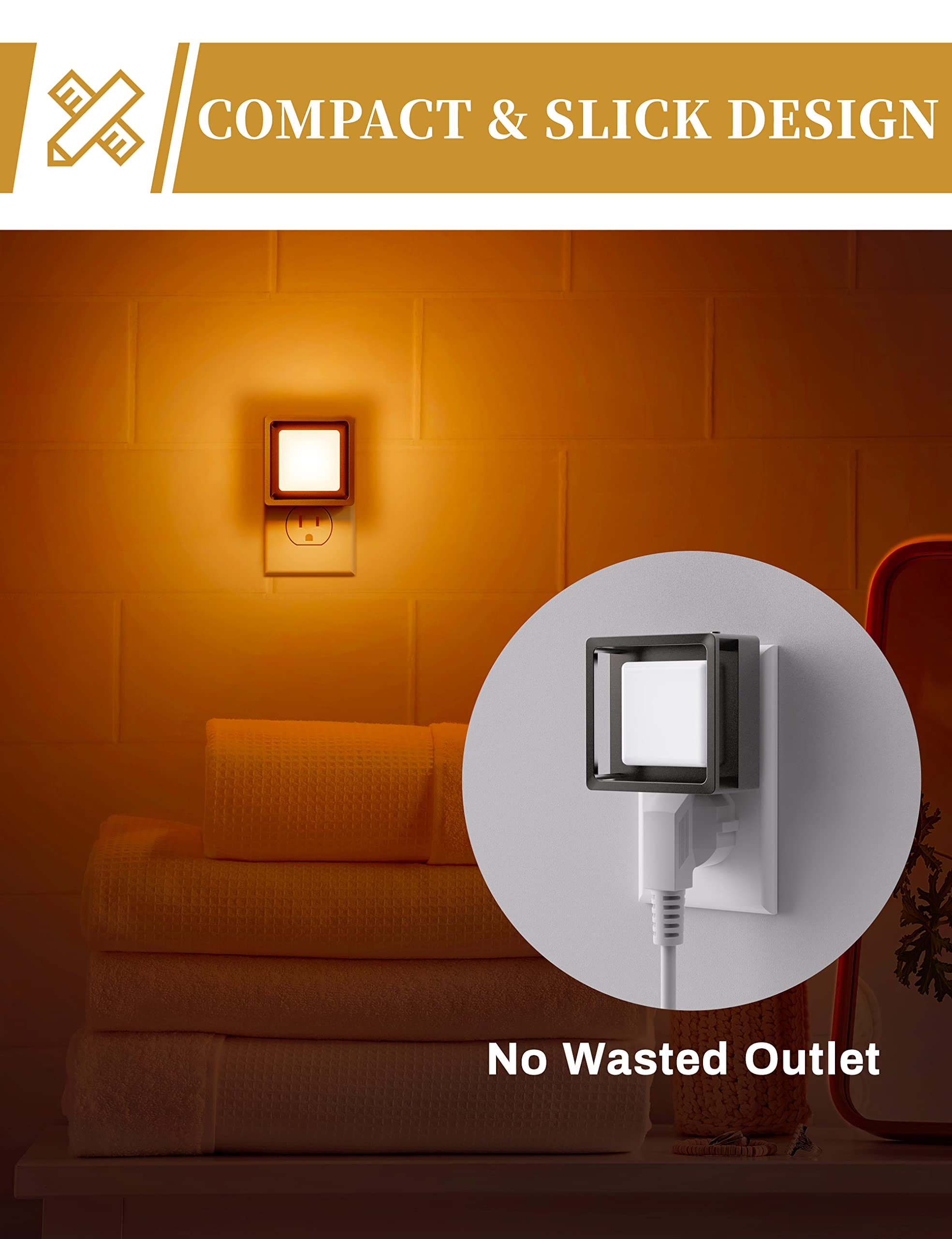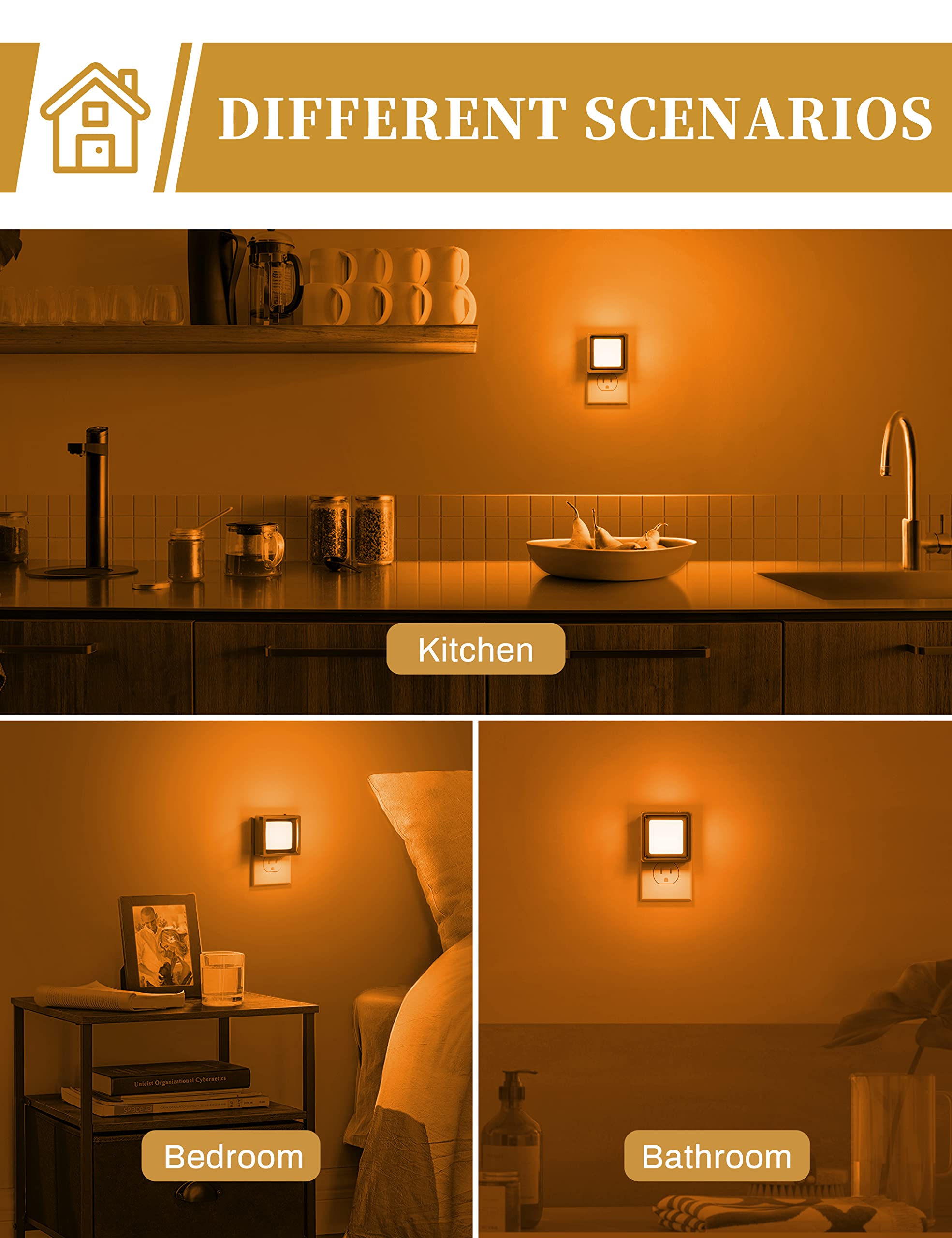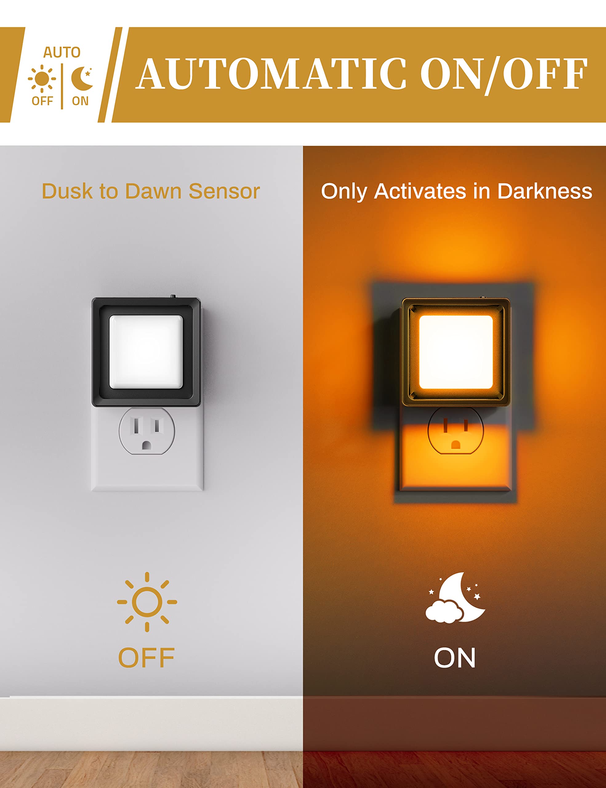 NIGHTLIGHTS WITH LIGHT SENSORS: The decorative night light with special smart light sensor chip will detect the luminance of surrounding environment, make night light turn on automatically at night and turn off in the daytime. Do not need to switch night lite on manually.
