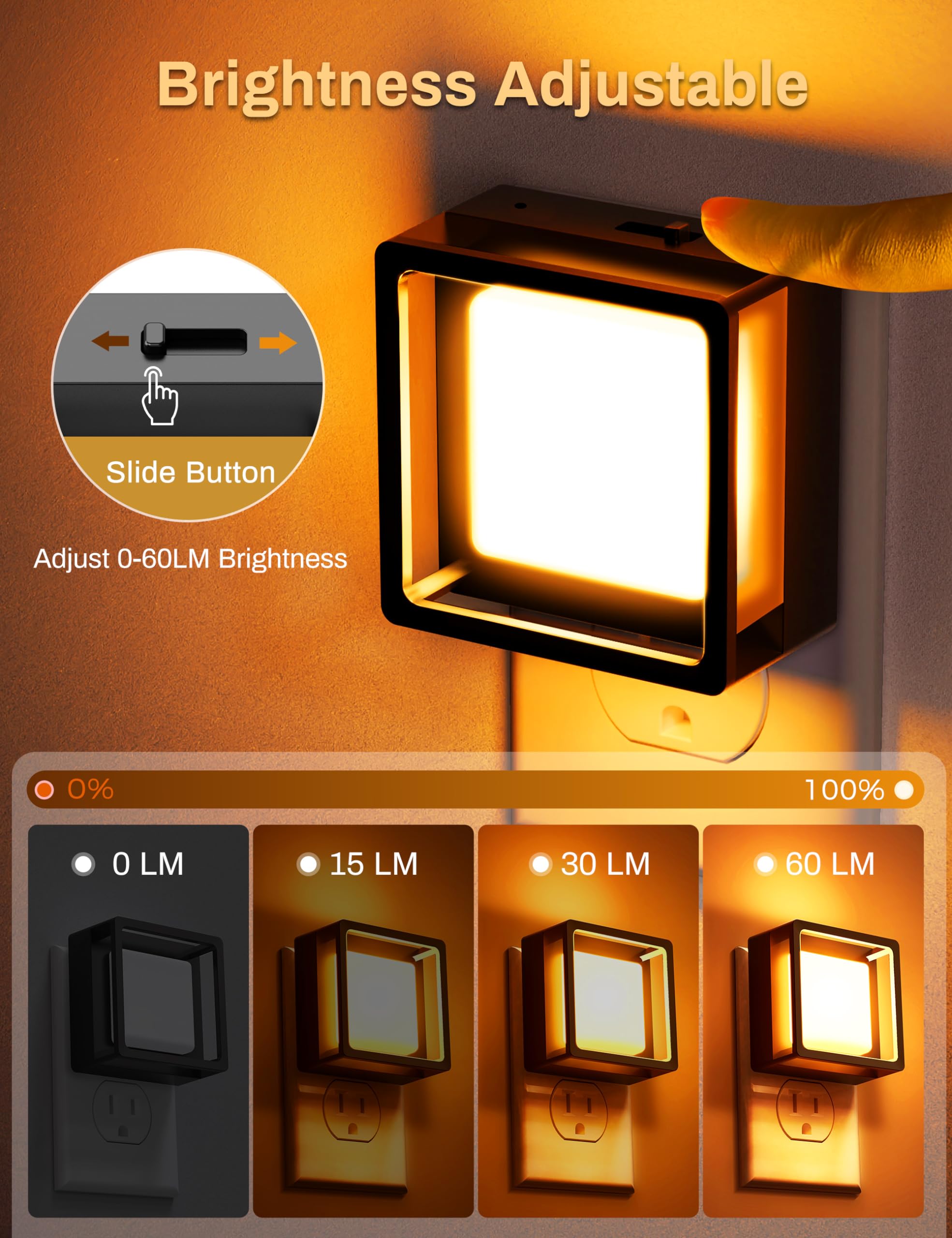 BRIGHTNESS ADJUSTABLE: This dimmable plug in night light are brightness adjustable from 0lm to 60lm with a slide switch. You can choose the brightness you want to cater to your different usage scenarios.