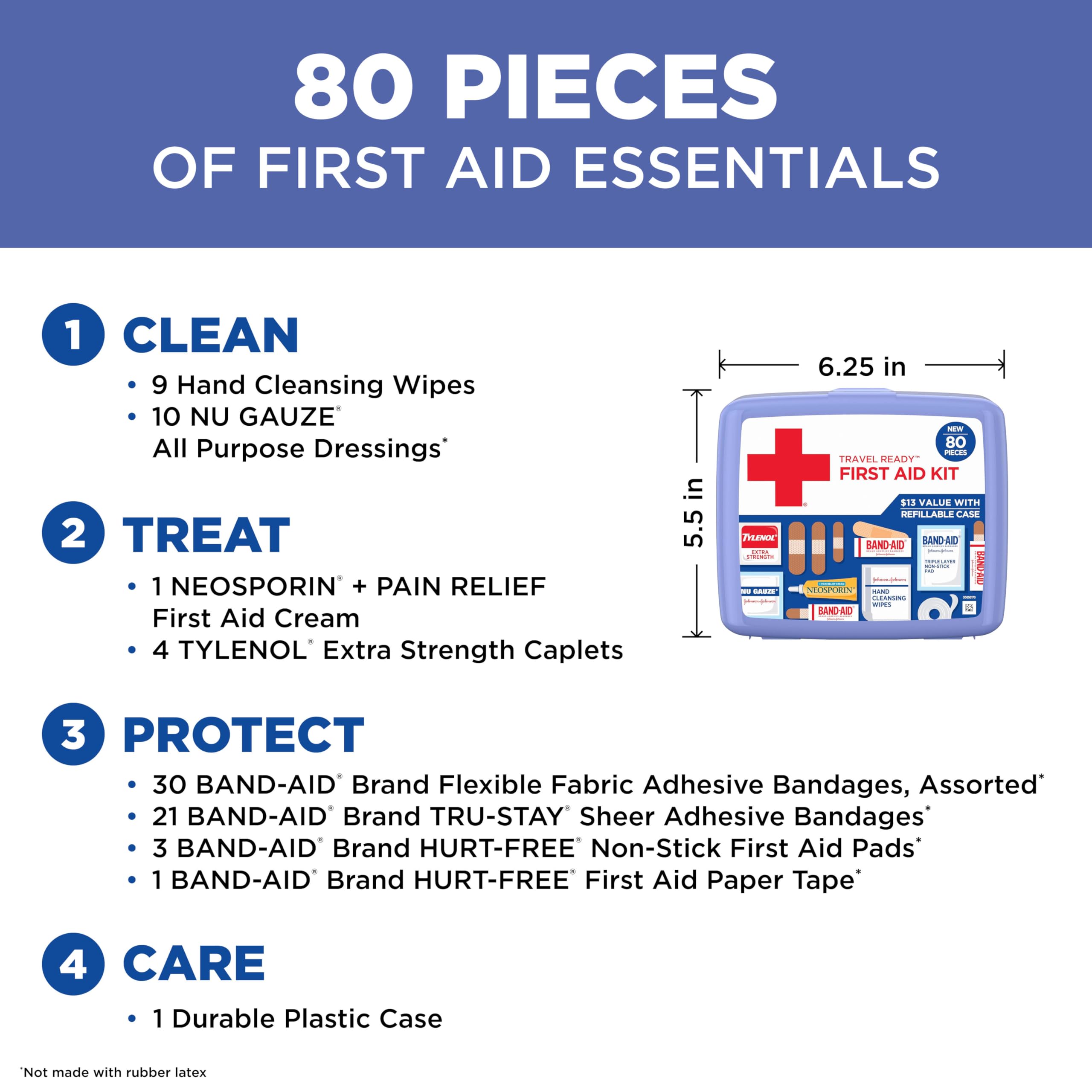 Stay prepared while on the road with the BAND-AID Brand Travel Ready First Aid Kit. Designed for pack-and-go convenience, this mini portable first aid kit contains essential wound care items for active travel but it's also ideal for home, cars, outdoors, dorms & camping. The easy-to-carry case contains products to help clean cuts and scrapes and prevent wound infection, including a variety of adhesive bandages in assorted sizes, cleansing wipes, antibiotic creams and gauze pads. The wound care kit contains premium items from brands such as BAND-AID Brand Adhesive Bandages and Neosporin. Complete with 80 first aid items, its convenient size is ideal for storing in your car, vehicle or luggage for emergency first aid on-the-go.