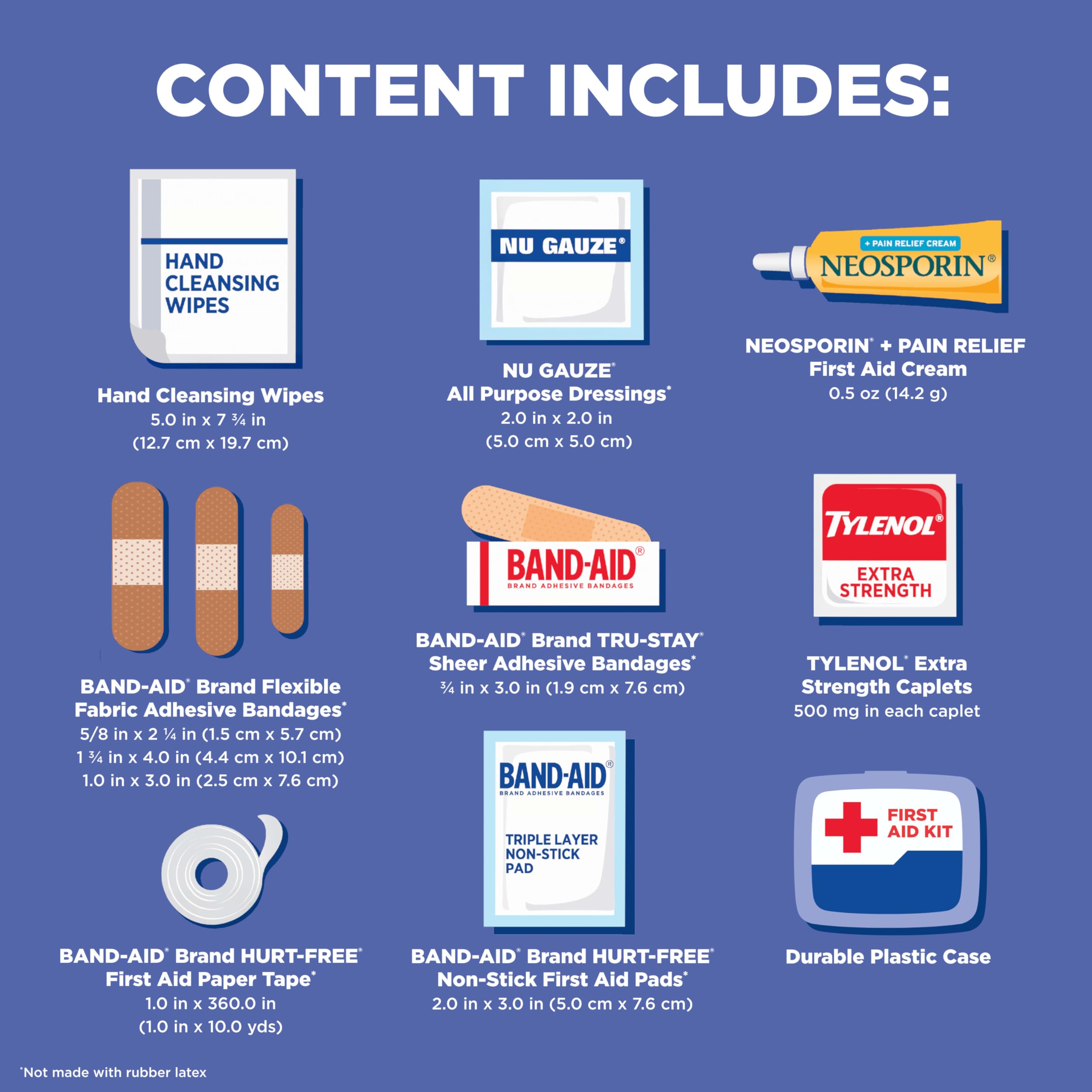 The mini first aid kit contains thirty BAND-AID Brand Flexible Fabric Adhesive Bandages in assorted sizes and twenty-one .75-by-3-inch BAND-AID Brand TRU-STAY Sheer Adhesive Bandages to cover and protect minor cuts and scrapes
