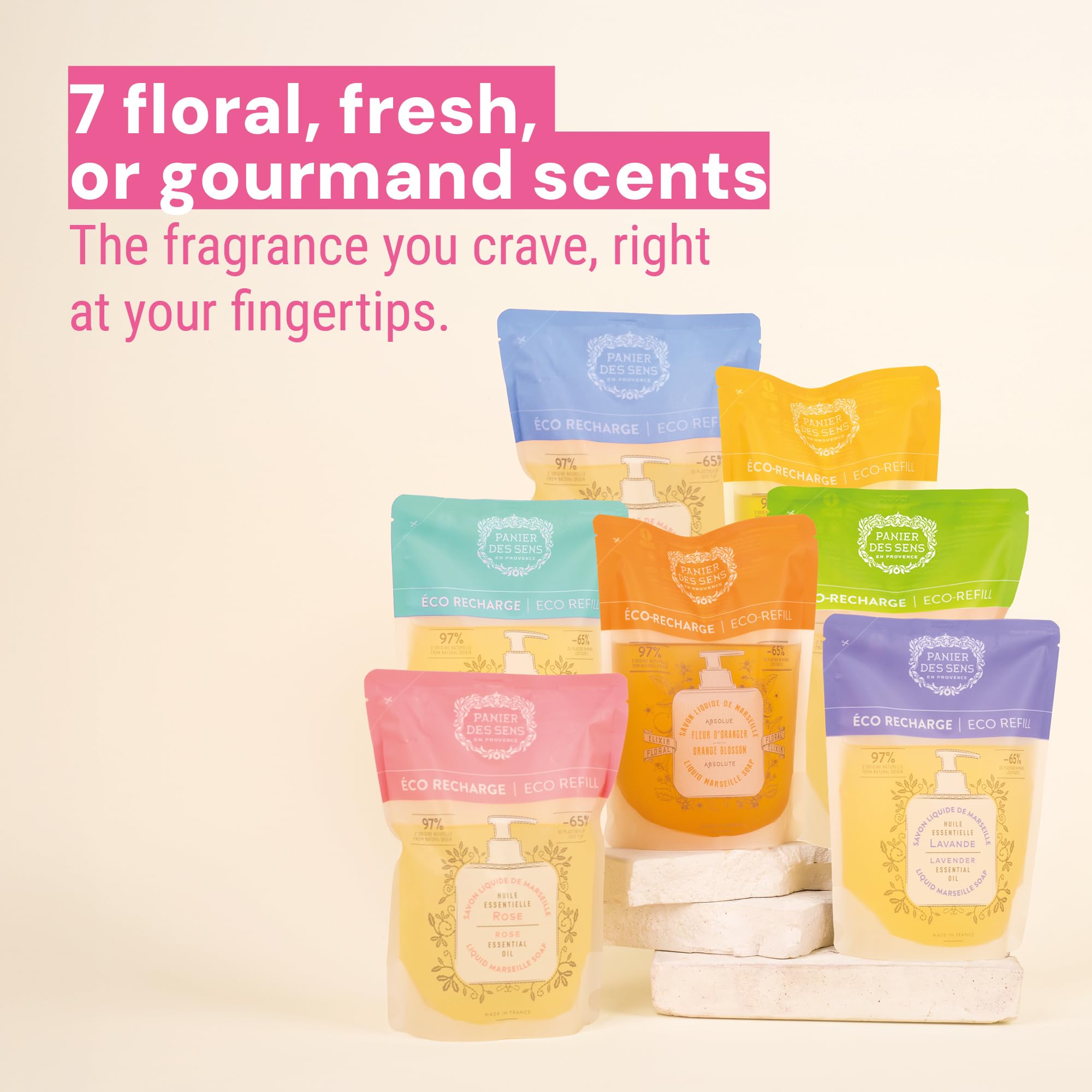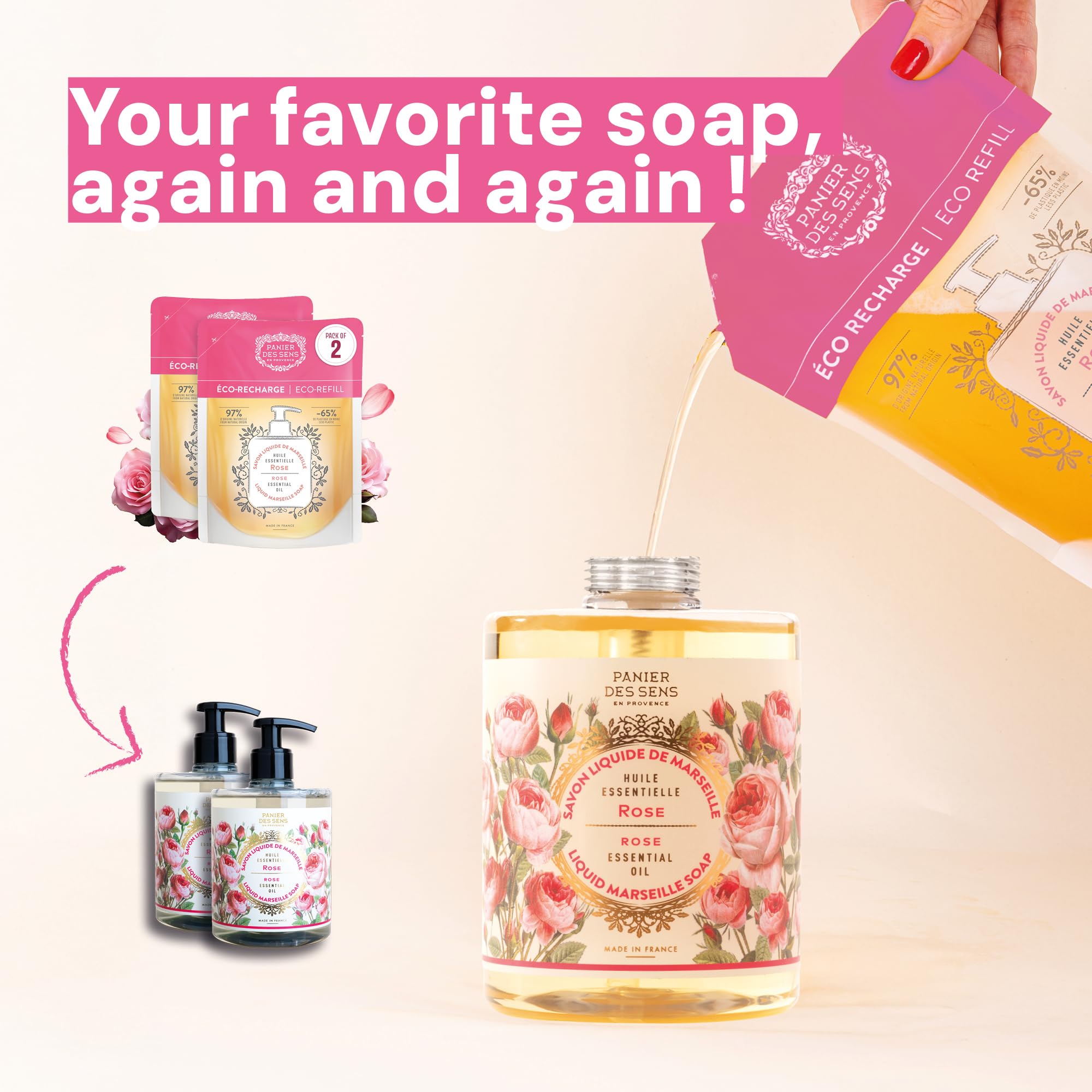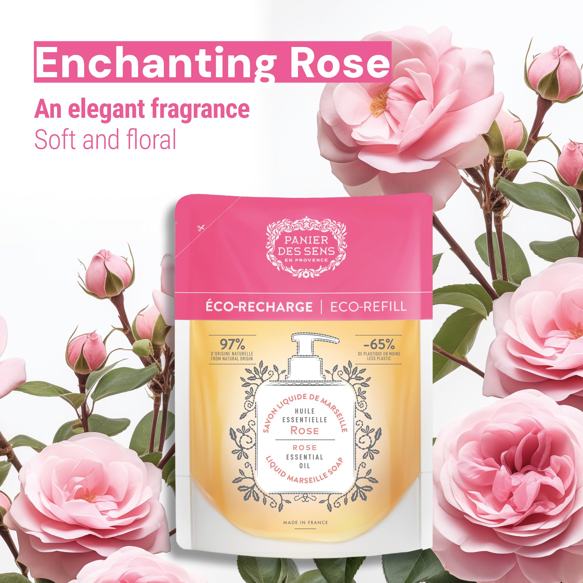 GENTLE MOISTURIZING HAND SOAP – Infused with coconut oil and rose essential oil, this soft soap refill gently cleanses without drying out hands. Rich in vitamin E, it deeply nourishes the skin while the calming scent of rose offers a moment of pure well-being.