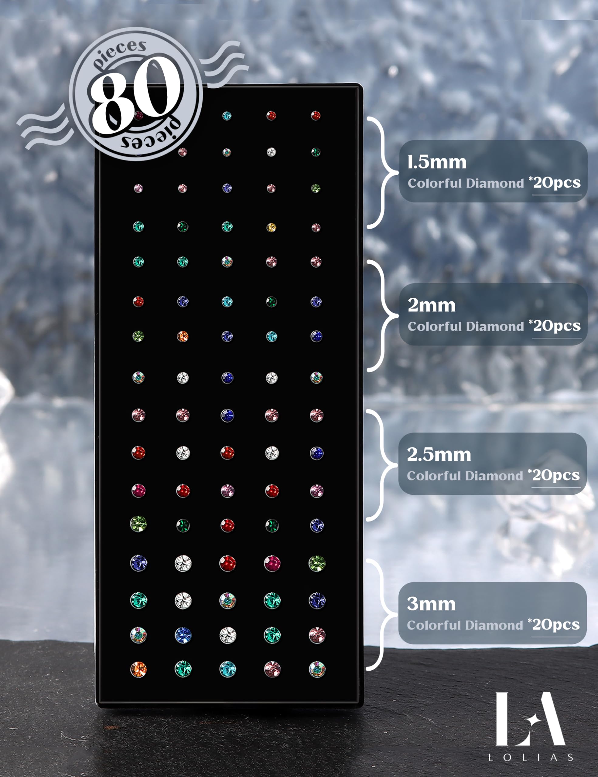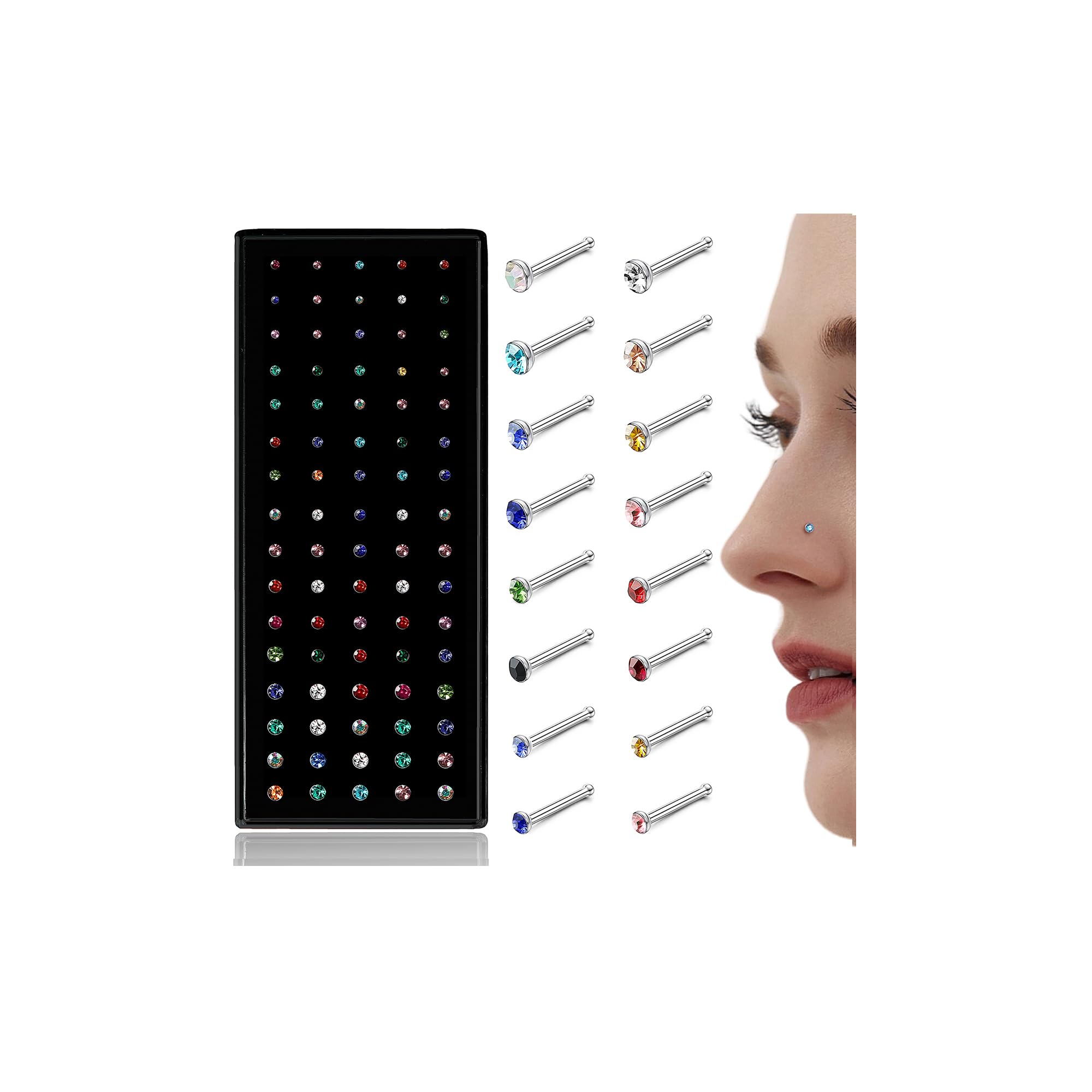 Afordable Nose Piercings Pack --Come with 80 Pcs Shiny white/colorful CZ nose pier in 1 box,including 20pcs 1.5mm,20pcs 2mm,20pcs 2.5mm& 20pcs 3mm nose studs for women, you can change the small nose rings studs as you like when you want different sizes to match.Easy to Put on, Will Not Come Loose Easily, Comfortable Wearing
