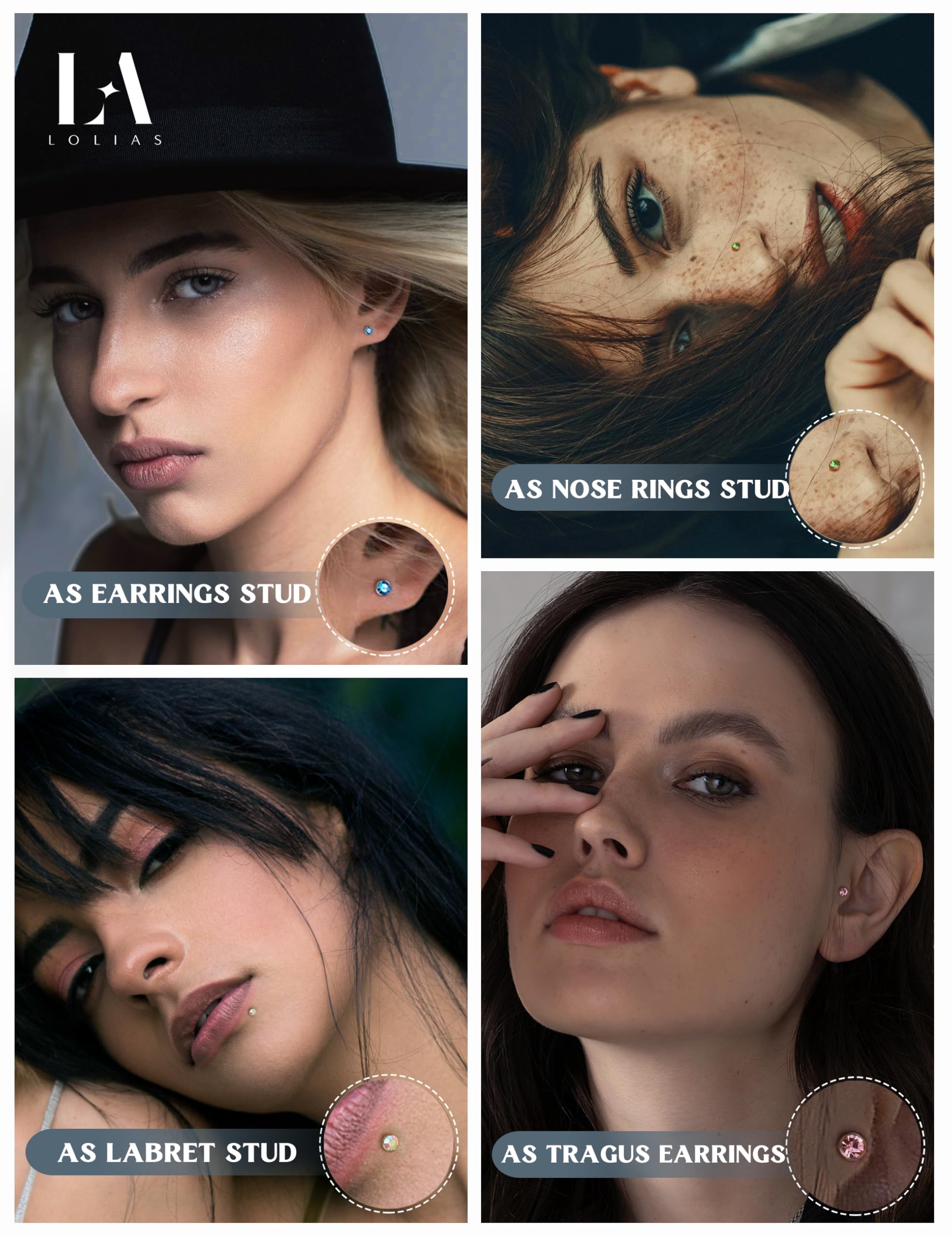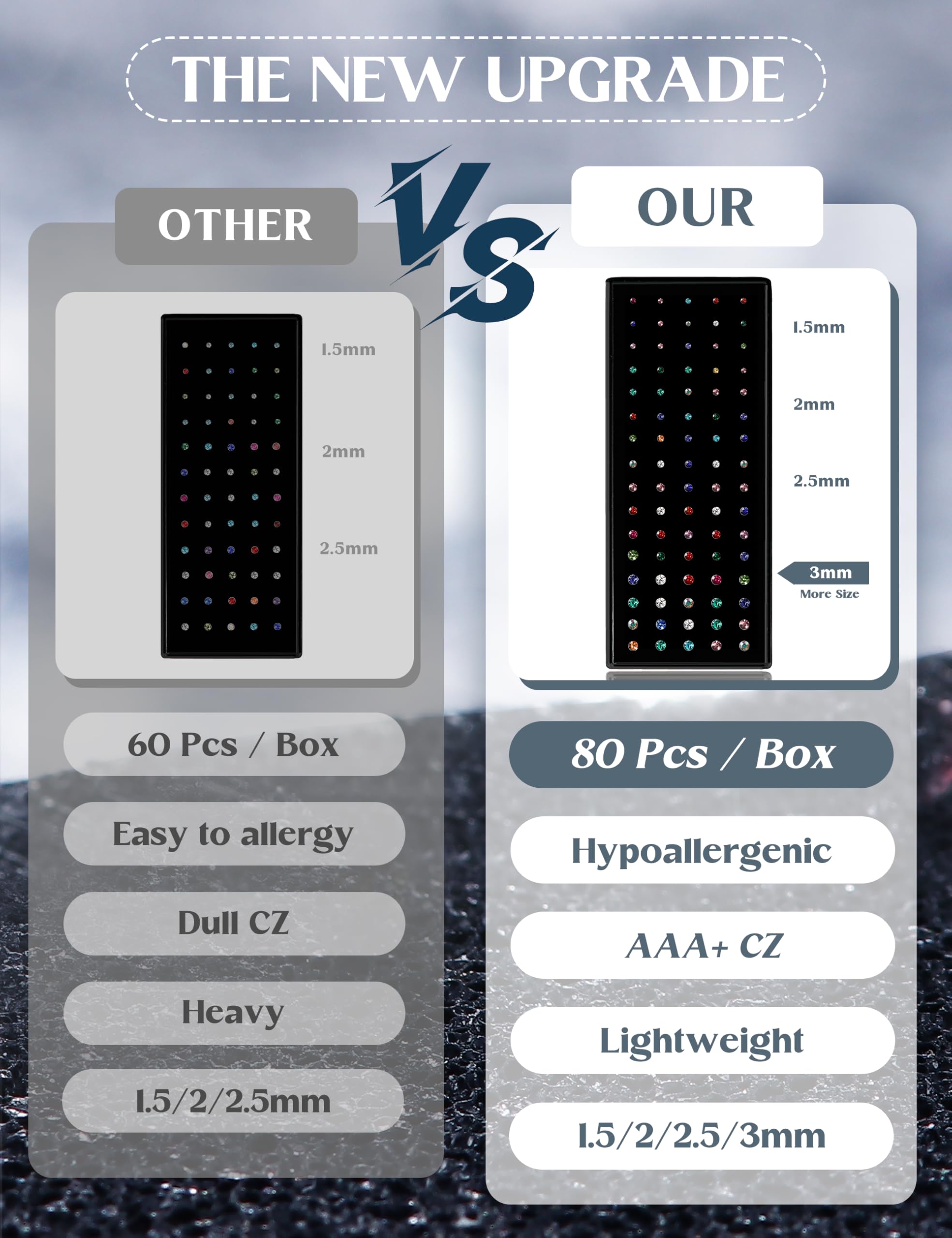 80Pcs/Box Nose Rings Studs -- After the upgrade, the number of nose studs in a box has increased to 80 Pcs/Box, and Bonus 20 Pcs 3mm CZ nose studs for women have been added to meet your more matching needs