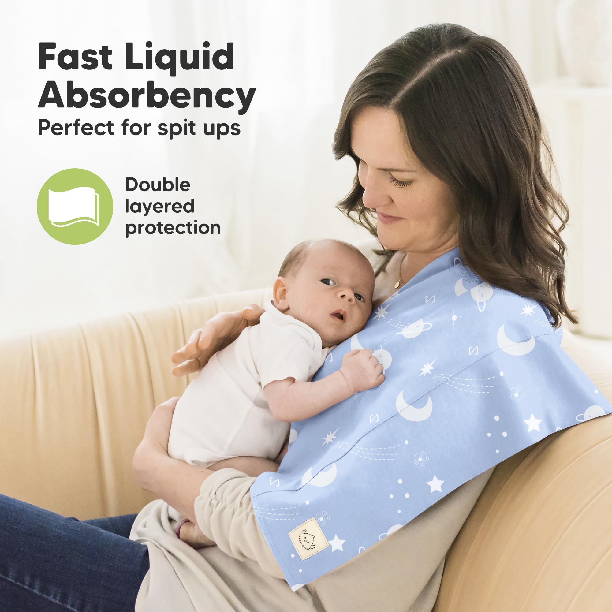 Super Absorbent, Catches Liquid Well - These burping cloths for babies sits on your shoulder comfortably, and the thick organic cotton catches rolling liquid and spit ups well.