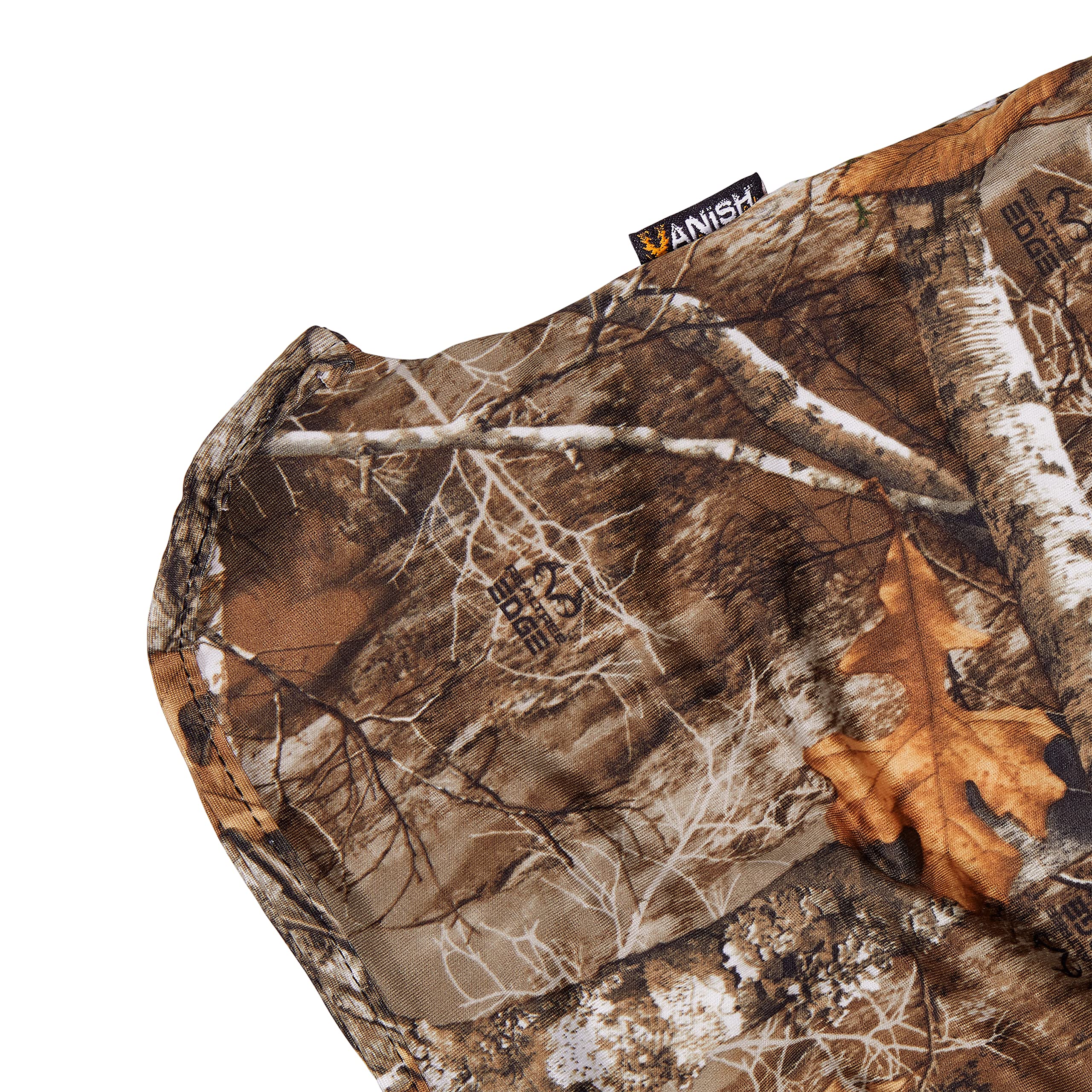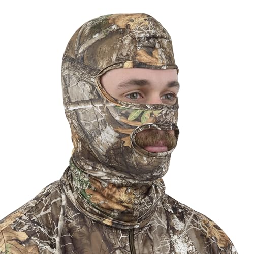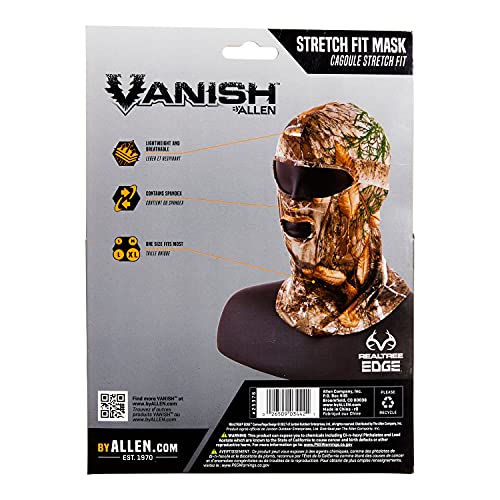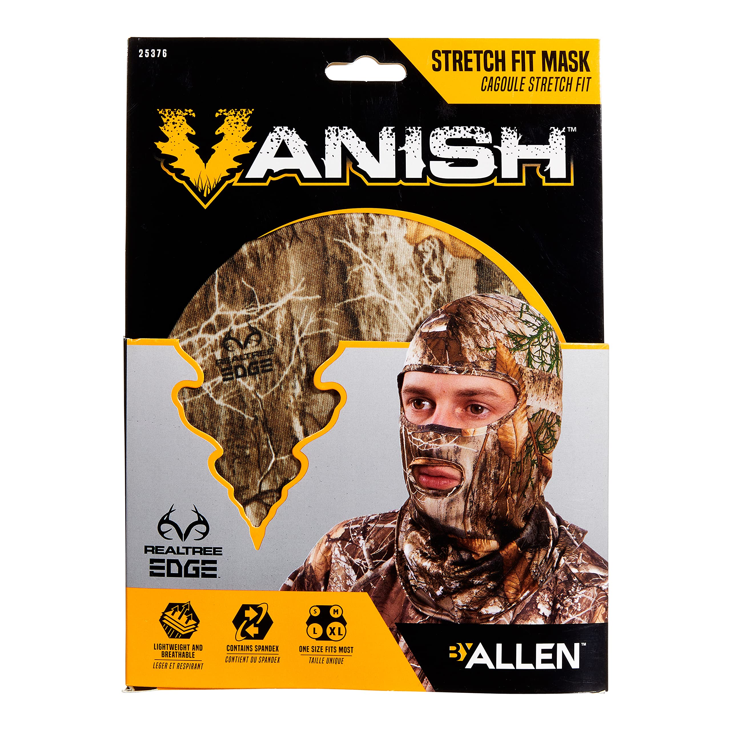 Real Tree Edge camo. Stretchy poly spandex material conforms to your head. Large eye opening for visibility, large enough for glasses, too. Mouth hole for easy call access and breathability. One size fits most.