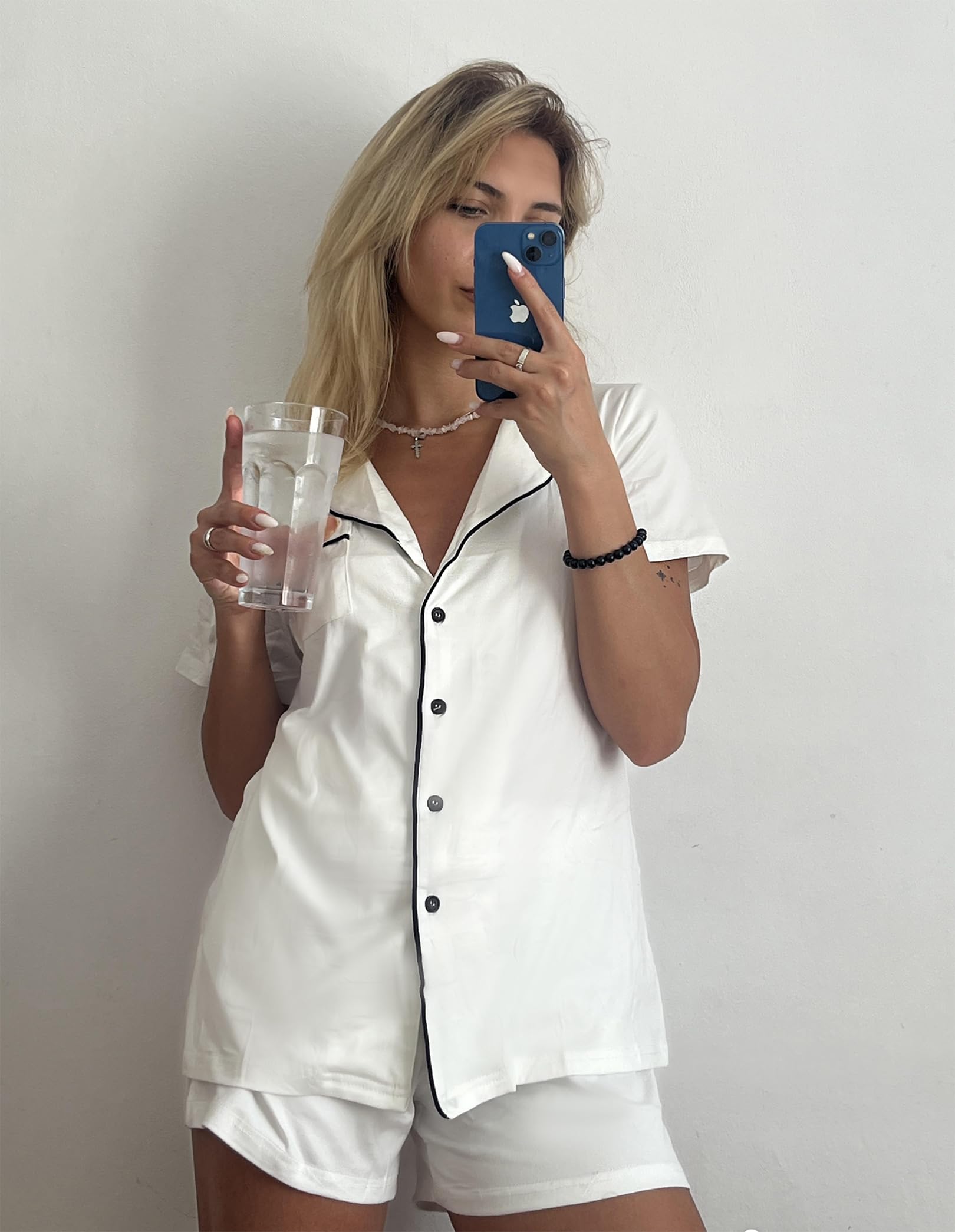 HUMANIZATION DESIGN: Features a hip-length button-down top with notch collar and chest pocket. Shorts include a chiffon drawstring elastic waist for maximum comfort.