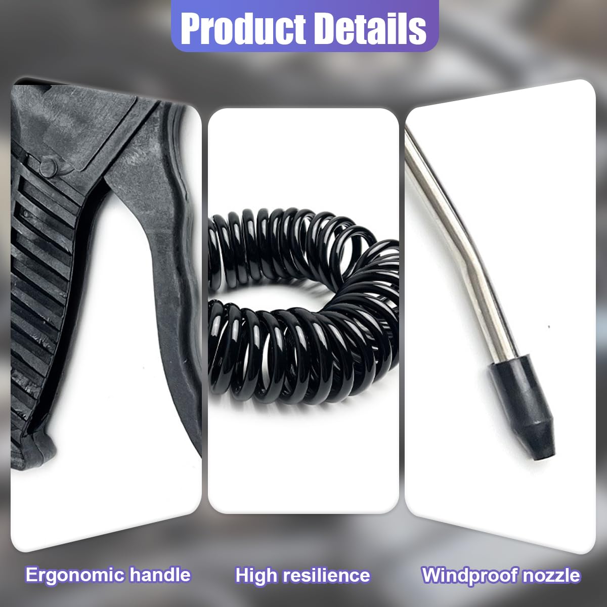 This air dust gun is equipped with a high-quality metal long nozzle, which can provide continuous cleaning pressure and deeply clean narrow and small gaps. SPECIFICATION: Brand: UHANBUT Name: Air Blow Gun Kit Color: Black Material: PU+Metal+Plastic SIZE: Car Air Dust Gun: 5.32 × 3.6 inch Car Recoil Air Hose: 0.19 × 0.31 inch Nozzle Tip: 1.53 × 2.75 inch Applicable: Most vehicles FEATURES: -With a length of 16.4 feet/5 meters, this air hose allows you to move less and operate more flexibly. -This air dusting gun is well-sealed to avoid air leakage and air pressure loss. -The handle of this car dusting gun is ergonomically designed for a comfortable and non-slip grip for safer operation.