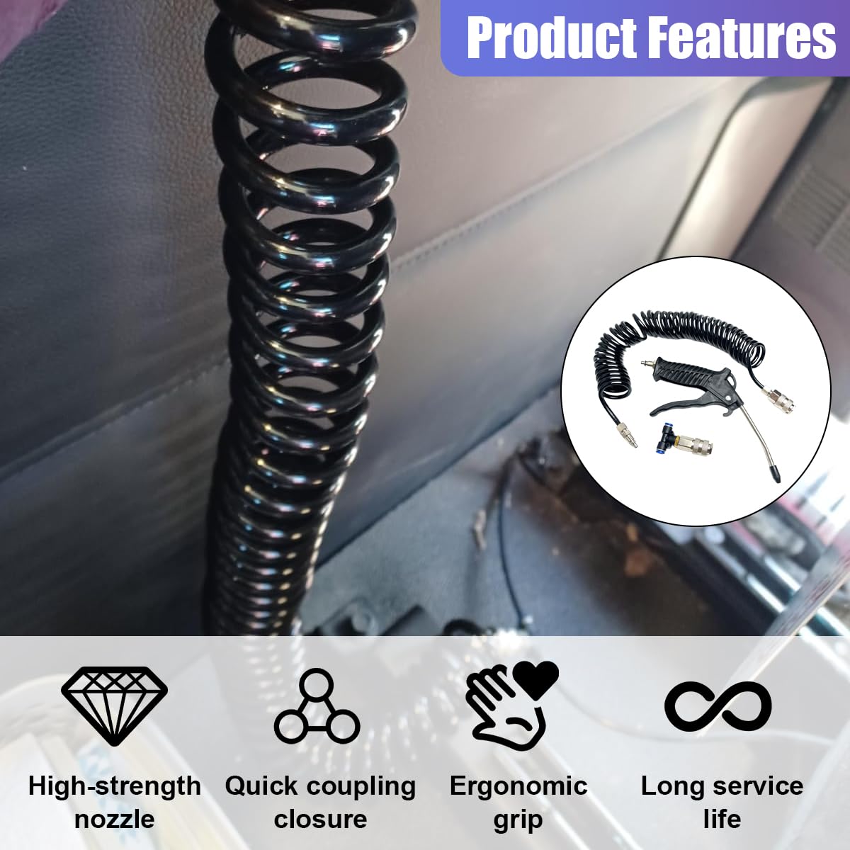 【Cleaning Kit for Air Seat System】: This air blow gun kit has a wide range of applications and is widely used for cleaning and blowing off all kinds of vehicles, whether it's stubborn dust, residual water droplets, or powder and debris, all of which can be quickly removed. You can also use it for home cleaning, it is the right choice for truck cleaning and maintenance.