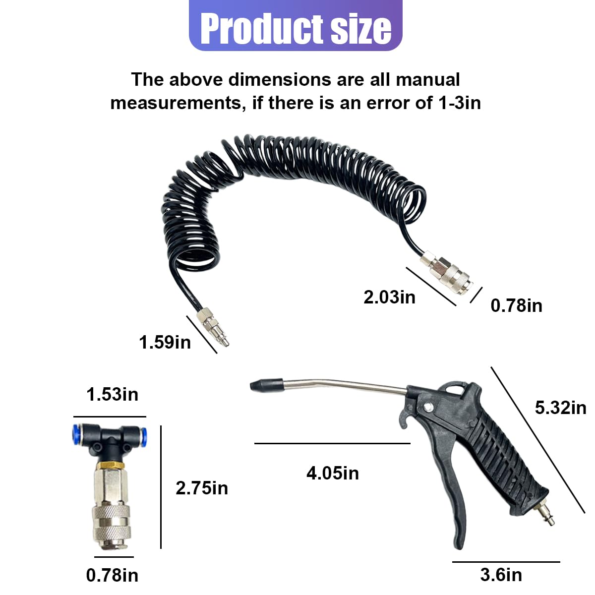 【Package and Size】: This kit contains 1 dust blower, 1 PU air hose with 8mm/0.31 inch OD, and 1 T-shape air connector, this dust blower kit can clean the cab and sleeper area efficiently in all directions and ensure clean air.
