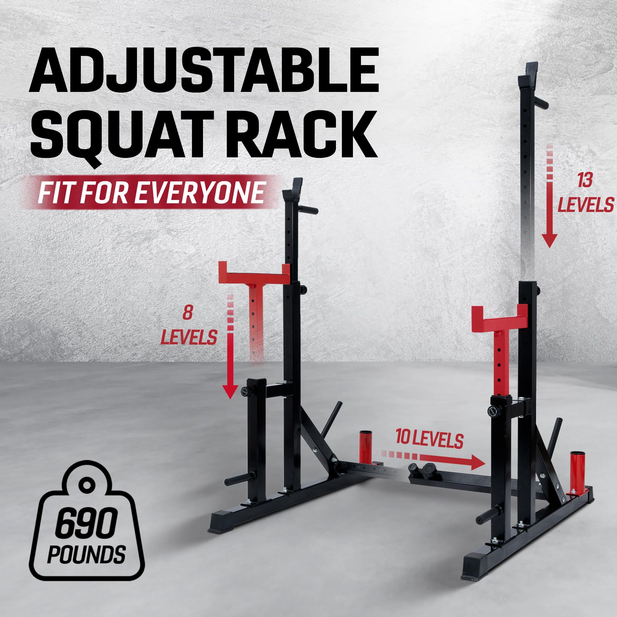 HIGH QUALITY CONSTRUCTION: Supports up to 690 LBS; Squat bench rack is made of thick steel frame, powder-coated for scratch resistance; Heavy steel structure and rubber feet offer stability, durability, and firmness for bench press rack during exercise