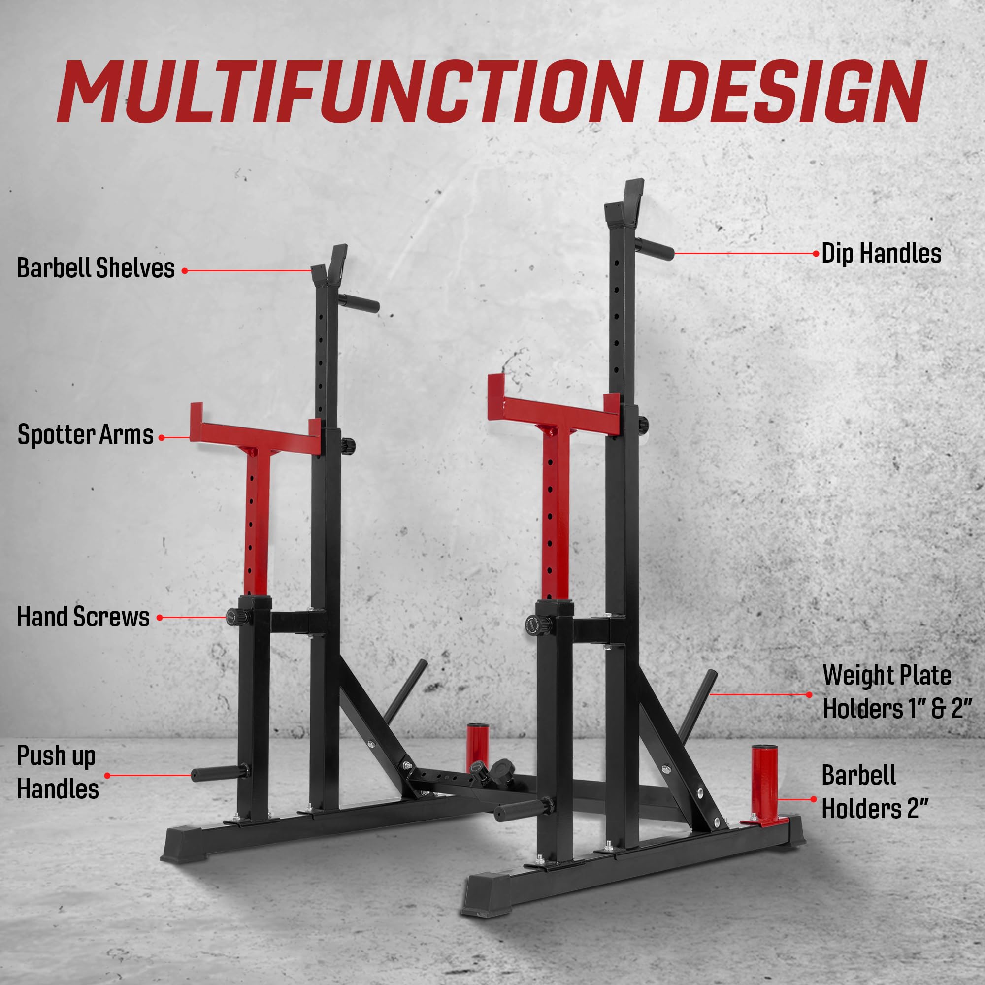 MULTIFUNCTION BARBELL RACK STAND DESIGN: This weight lifting rack is multifunctional, allowing for a variety of exercises including dips, shoulder presses, squats, inclines, and overhead weight lifting; Barbell stand's a great addition to home gym rack!