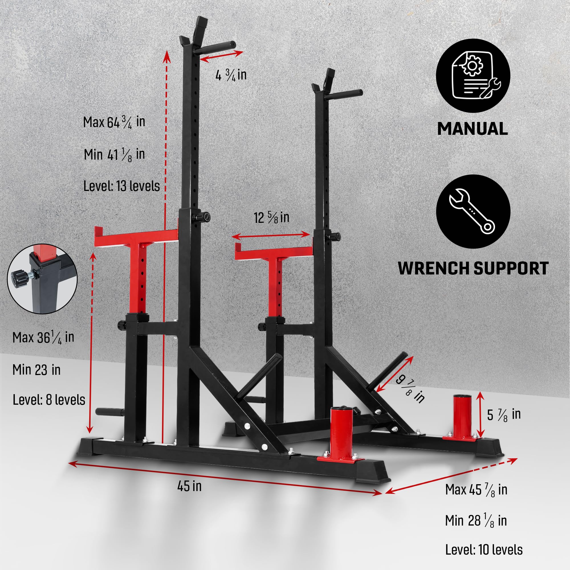 SUITABLE DISTANCE BETWEEN SLOTS: Featured 13-level handle's height (36.9 - 60.3 in); 10-level width (27.2 - 44.9 in) and 8-level spotter arm’s height (23 - 36.1 in), adjustable home squat stand offers versatility for weight lifting, easier barbell pickup
