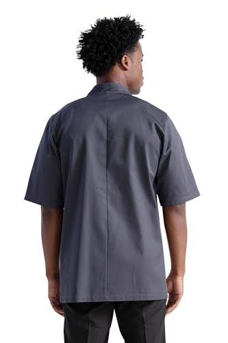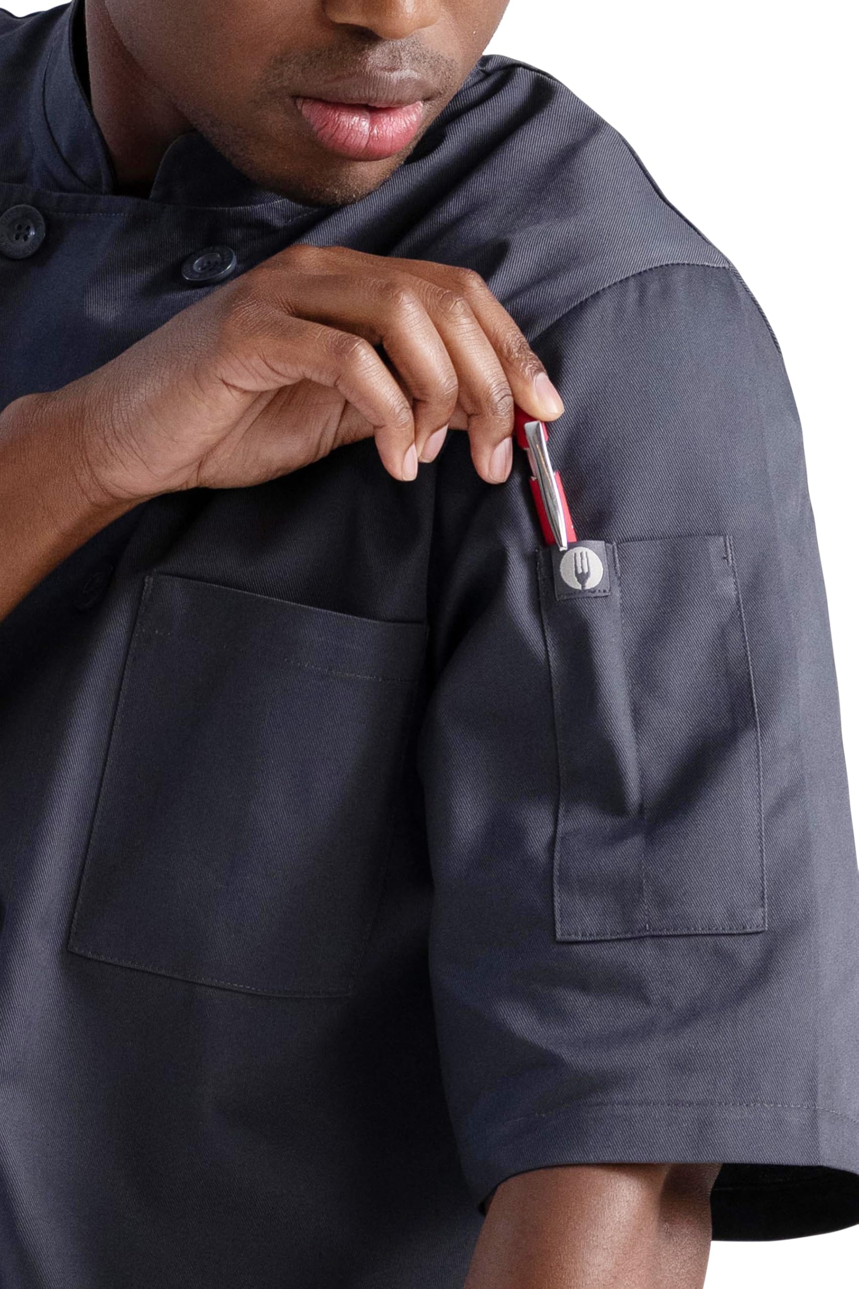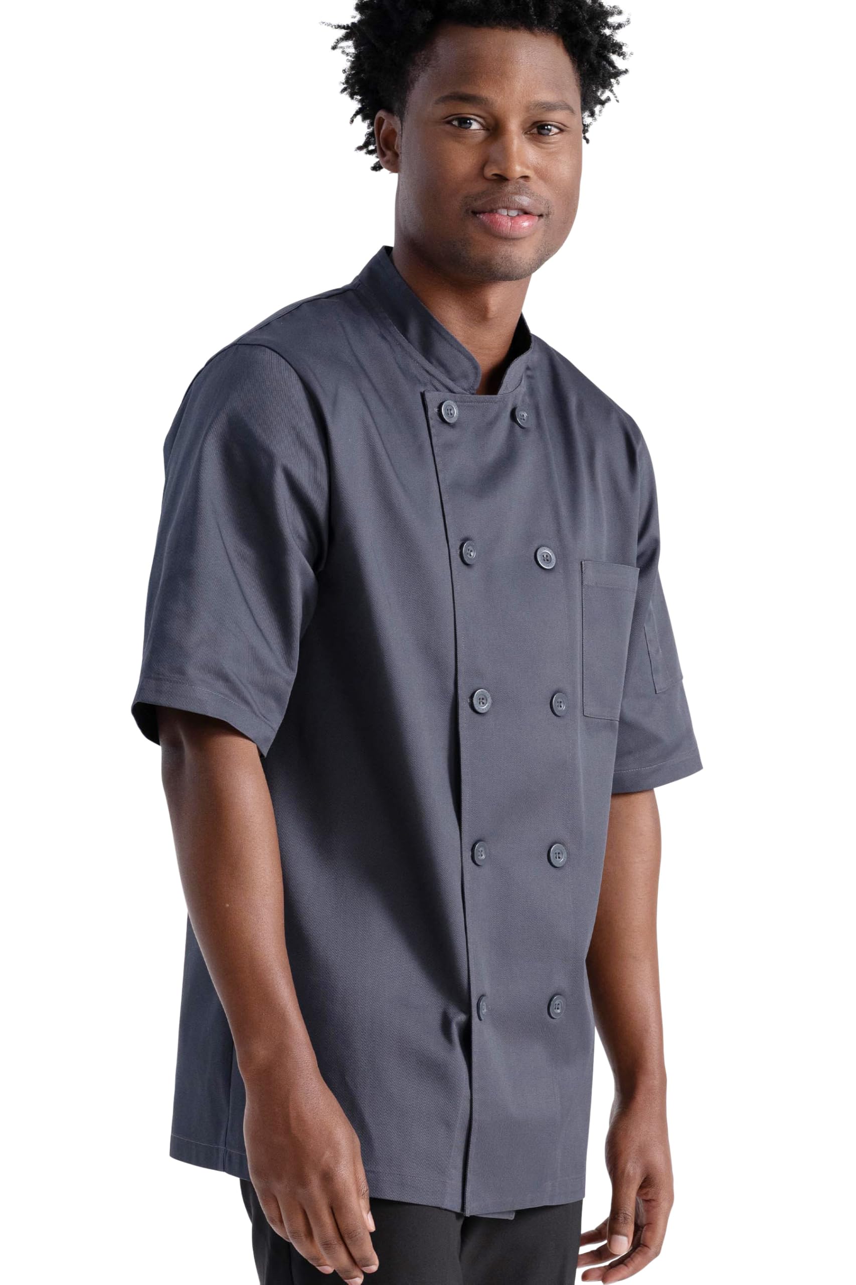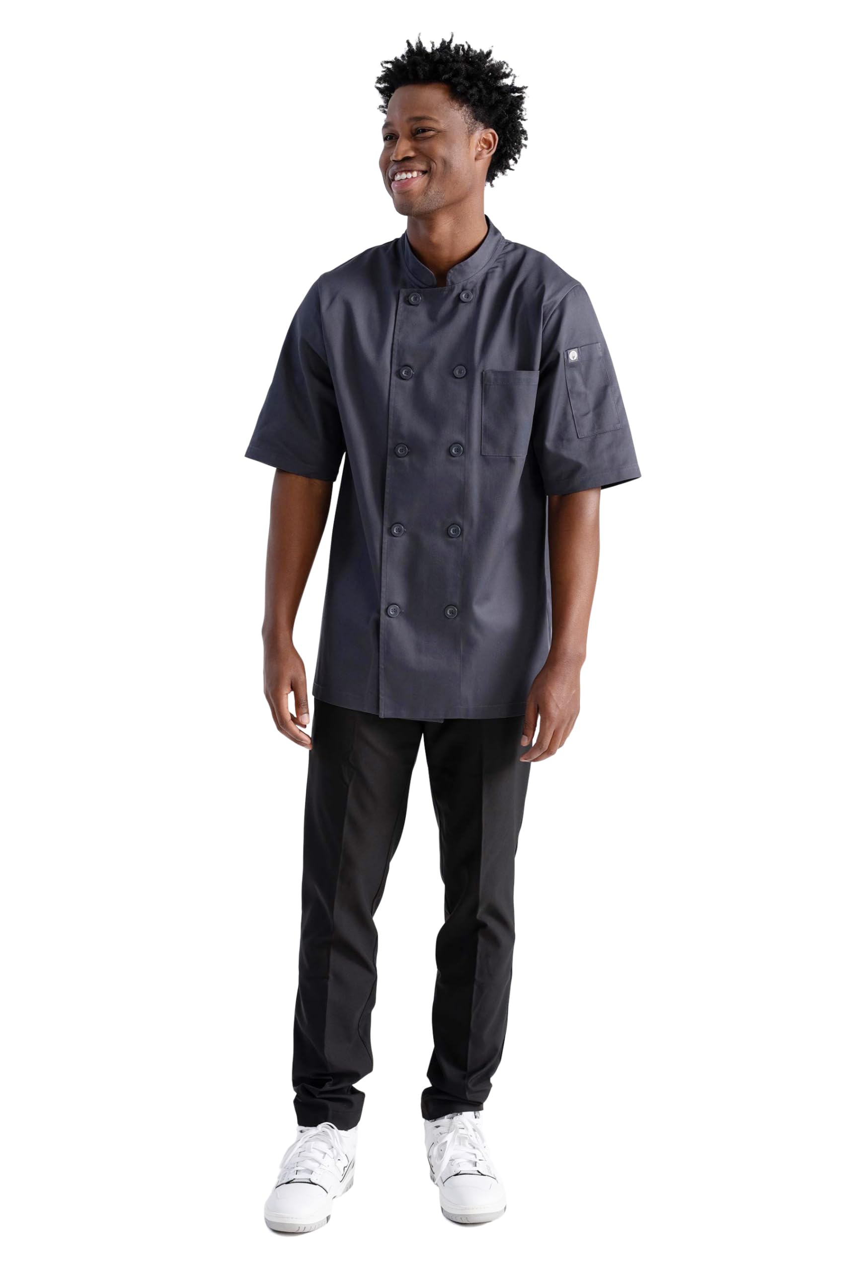 Added Features - Double-breasted button front, left-chest patch pocket, left-sleeve thermometer pocket, and a stand-up collar.