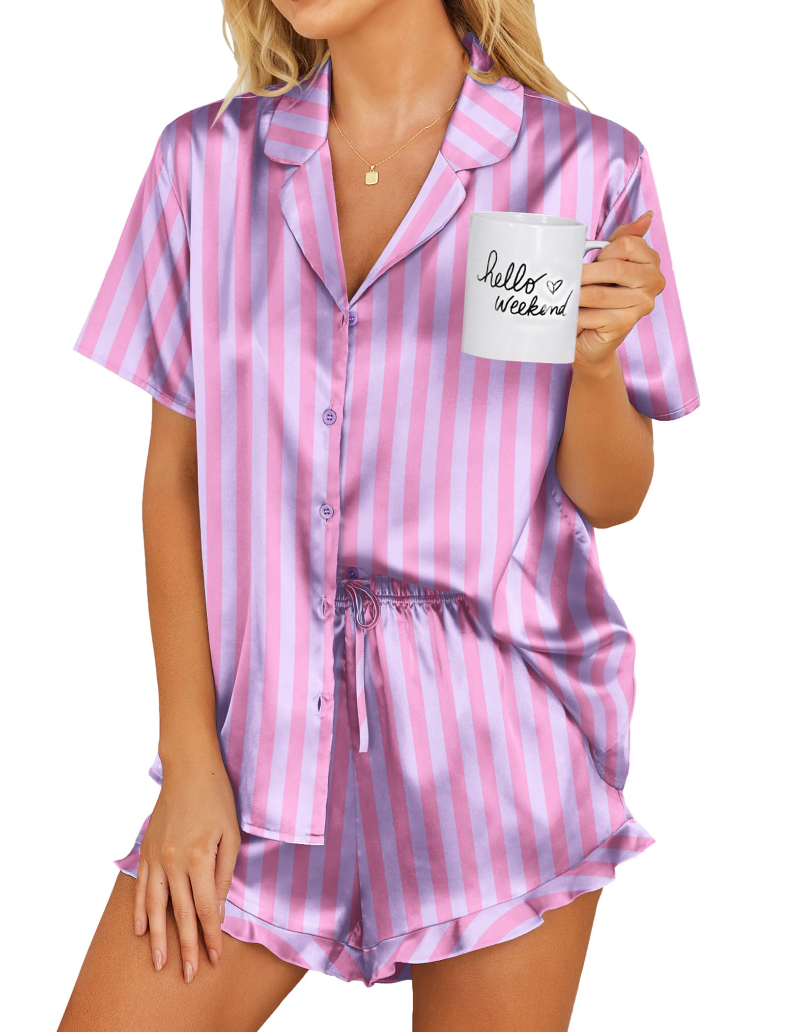 【Unique Fashion Designed】: 2 Piece Satin Pajama Set Featuring Relaxed Style, Short Sleeve, Classic Notch Collar, Full Button Design is easy to put on and take off. Cute Print Pj Set With Elastic Waist Contrast Trim Pajama Shorts will give you more comfortable and freendom feeling when you wear it.