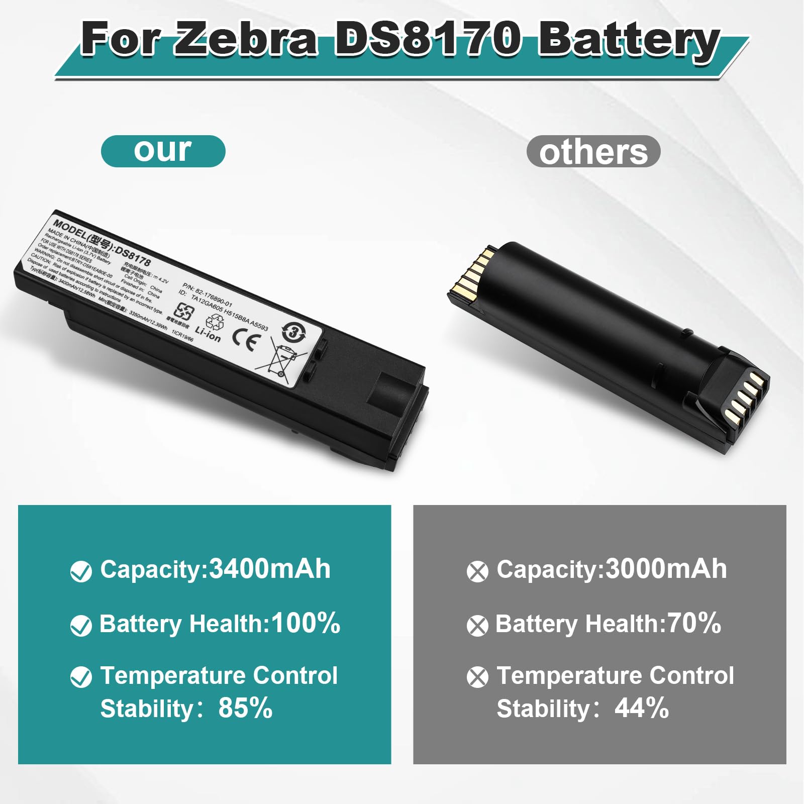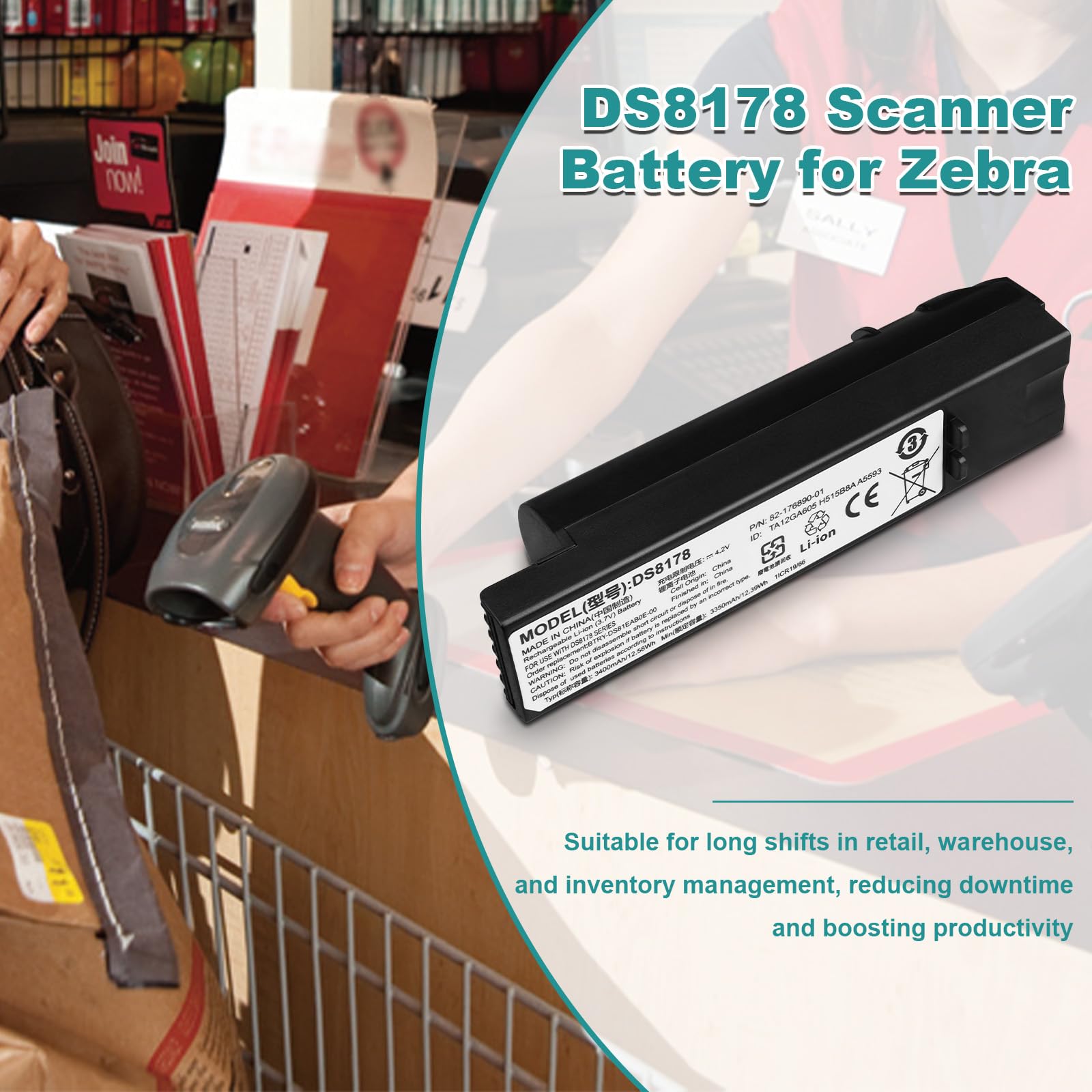 [DS8178 Scanner Battery for Zebra]: 3400mAh capacity lithium-ion battery, this replacement battery significantly extends your scanner's operational time between charges. Suitable for long shifts in retail, warehouse, and inventory management, reducing downtime and boosting productivity