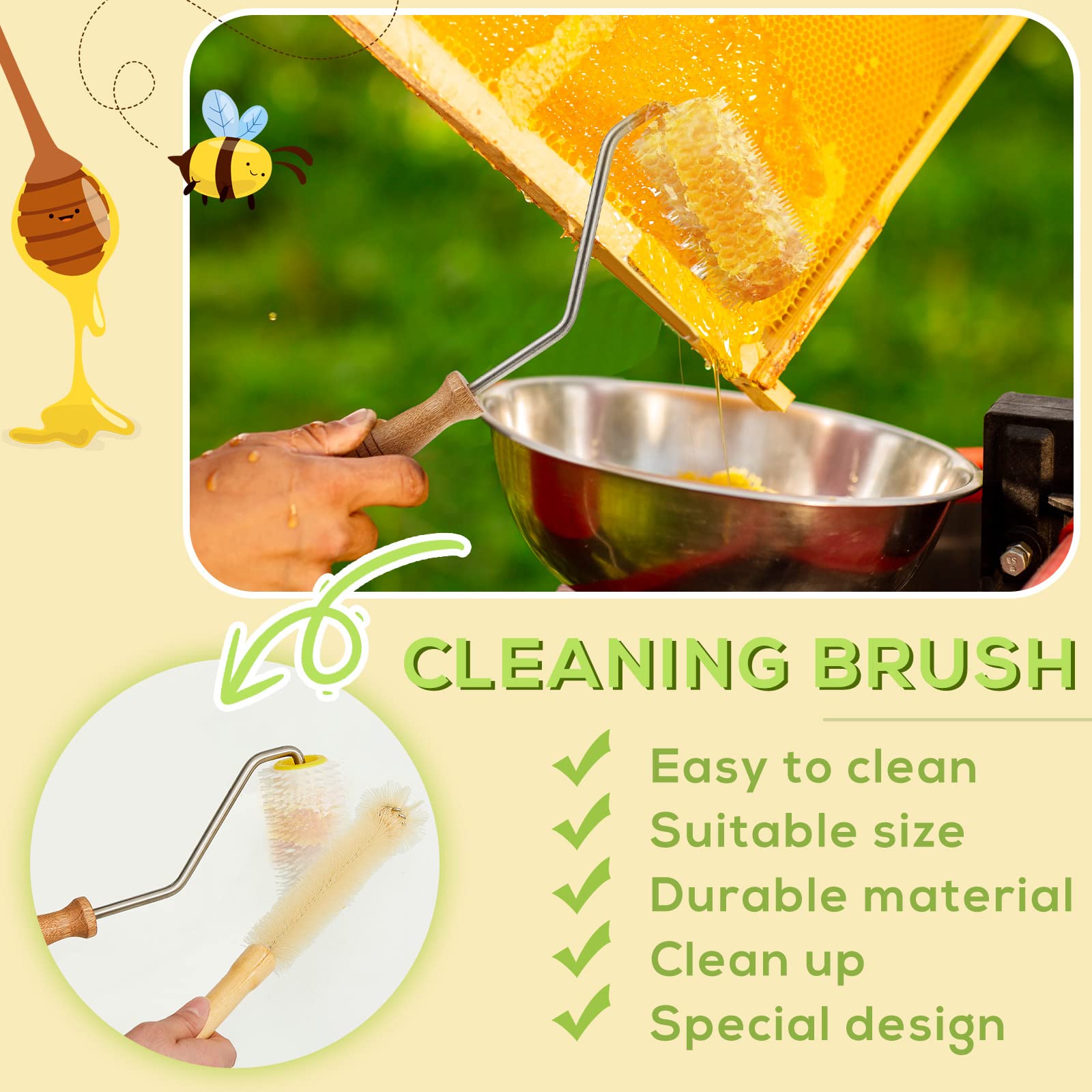 Practical Combination: the combination of honey extractors with rollers and a cleaning brush can solve the problem that the rollers are not easy to clean; The size of the brush is suitable for cleaning the rollers, and it is small and easy to carry