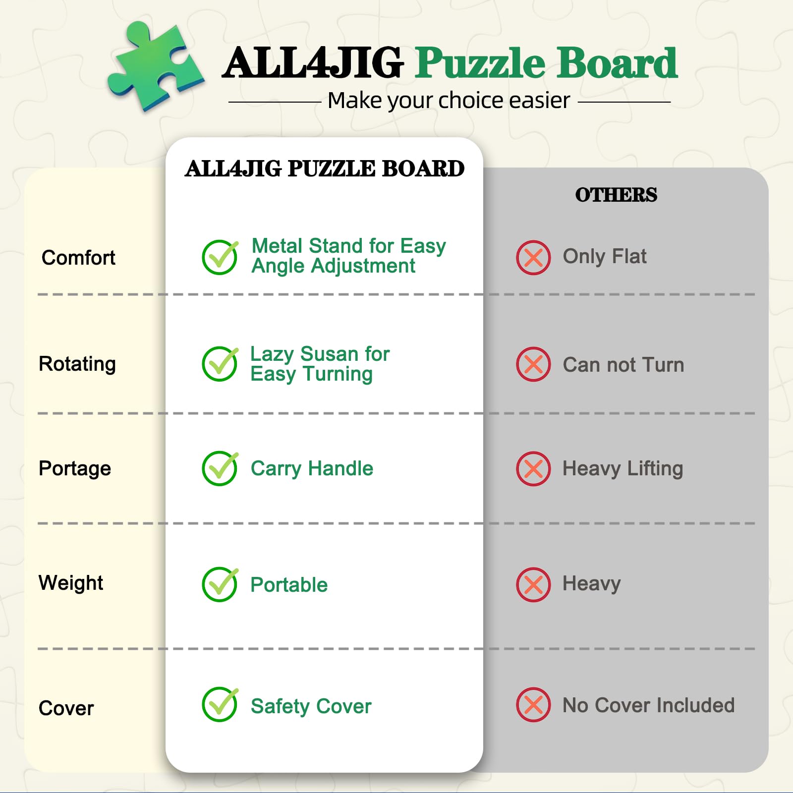 【Innovative 2-in-1 Design】 The ALL4JIG puzzle board features 360° rotation and a angle adjustable tilt, allowing easy access to all sections while reducing neck and back strain. Enjoy a comfortable, stable puzzling experience with flexibility in every turn