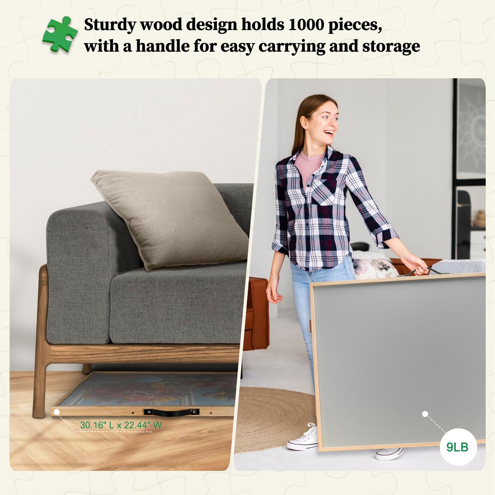 【Premium Natural Wood & High Capacity】 Built with quality natural wood, this board supports up to 1000-piece puzzles, offering both durability and an eco-friendly touch. Its robust design, complete with a handle, allows for easy transport and storage