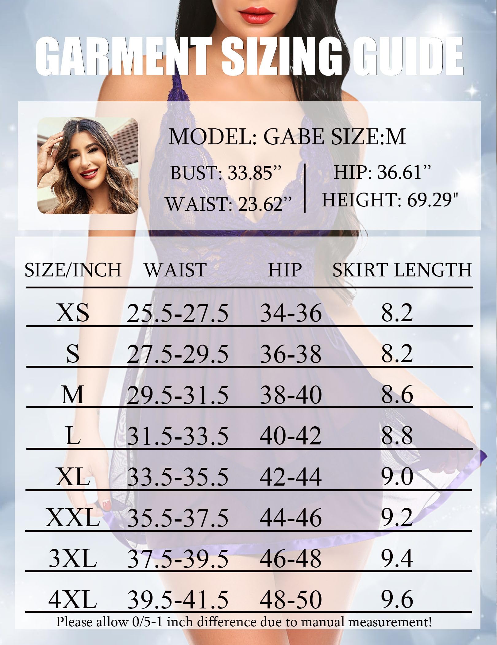 【Unique Design】This lace babydoll lingerie features deep V-neck lace cups and open back design that beautifully contours feminine silhouette.Practical V-shaped adjustable straps ensure perfect fit and all-day comfort.Luxurious satin hem trim adds elegant detail.Sexy lace panty can be worn as a set or alone,2-in-1 design is more convenience for your trip