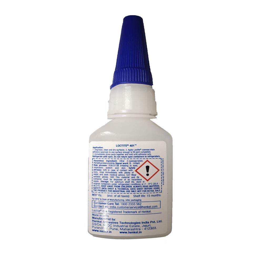 LOCTITE 401 is an instant adhesive designed for the assembly of difficult-to-bond materials requiring uniform stress distribution and high tensile and/or shear strength. The product provides for the rapid bonding of a wide range of materials, including metals, plastics and elastomers. LOCTITE 401 is also suited to bonding porous materials such as wood, paper, leather and fabric. Perfect for all quick repairs and all types of small emergency repairs.
