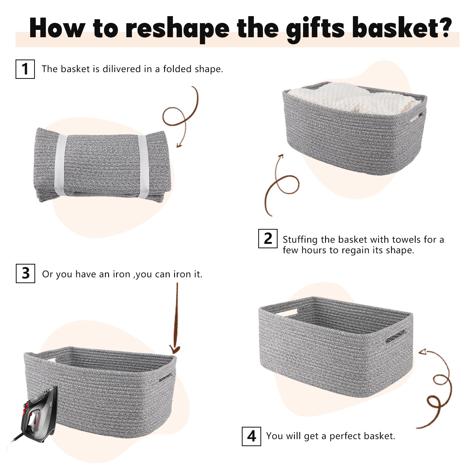 Easy to reshape: The toy basket arrives folded, once you receive it, remove it from its packaging and fill it with items such as clothing or dolls to help the baskets for shelves regain its shape. If you have an iron, you can also help it get back into shape quickly. If you have any questions about our products or services, please feel free to contact us