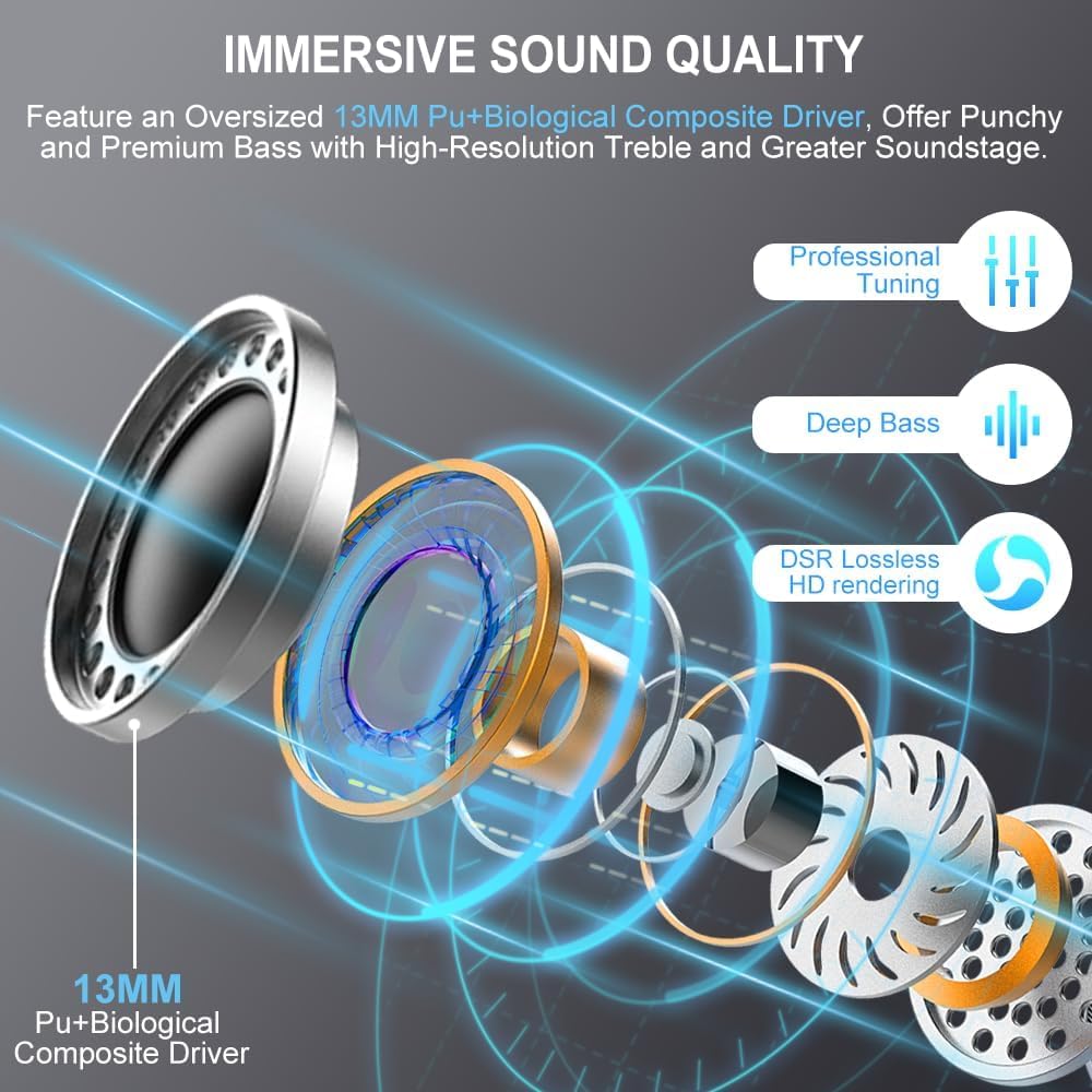 Stereo Deep Bass and Clear Call: Wireless earphones adopt with DSR lossless HD rendering technology and equip with premium 13mm dynamic driver-the drive area is 4 times than the normal drive area, making the bass punchier and midrange full and textured, treble crystal crisp. Large chamber acoustic design well balances the internal and external air pressure to avoid sound loss, bluetooth earphones are combined ENC noise cancelling mic ensuring you can be heard clearly even in noisy environment.