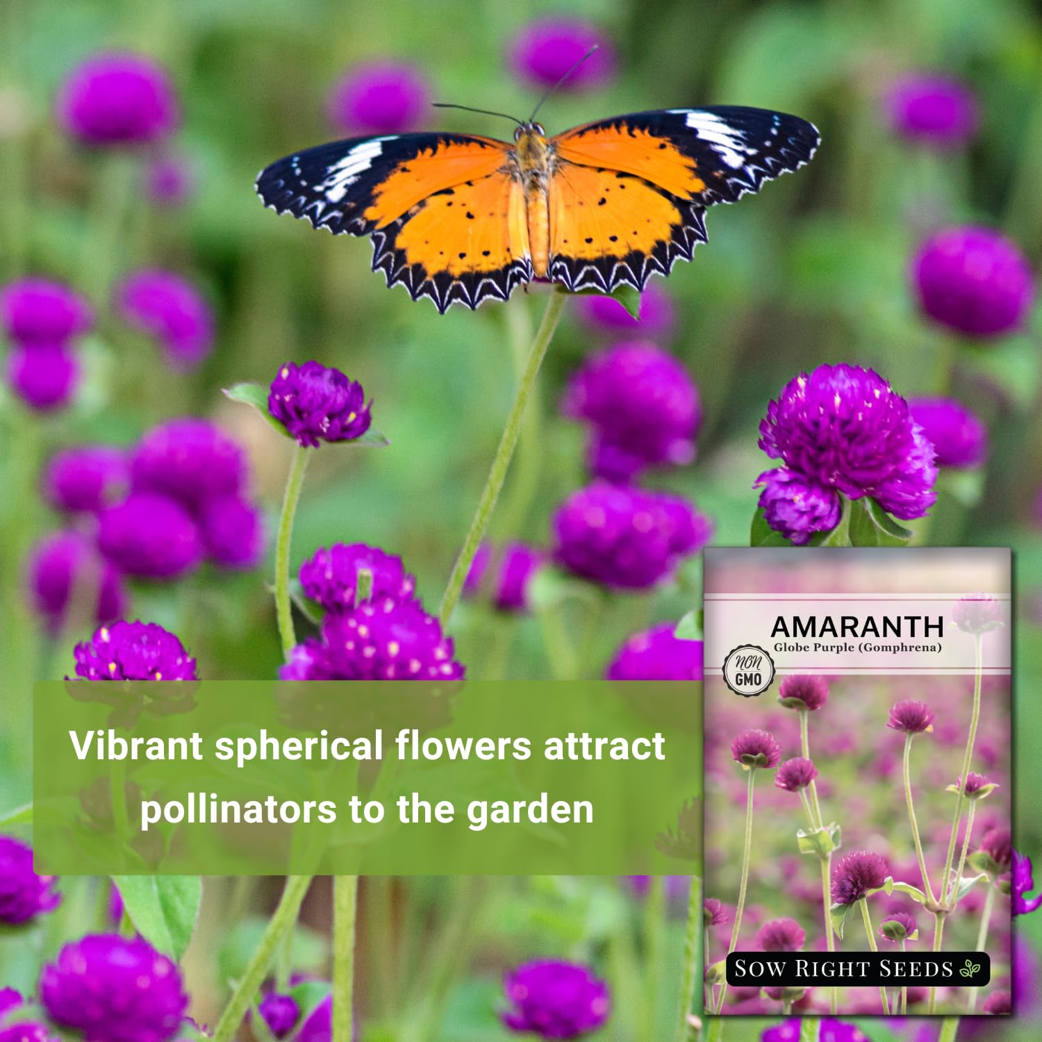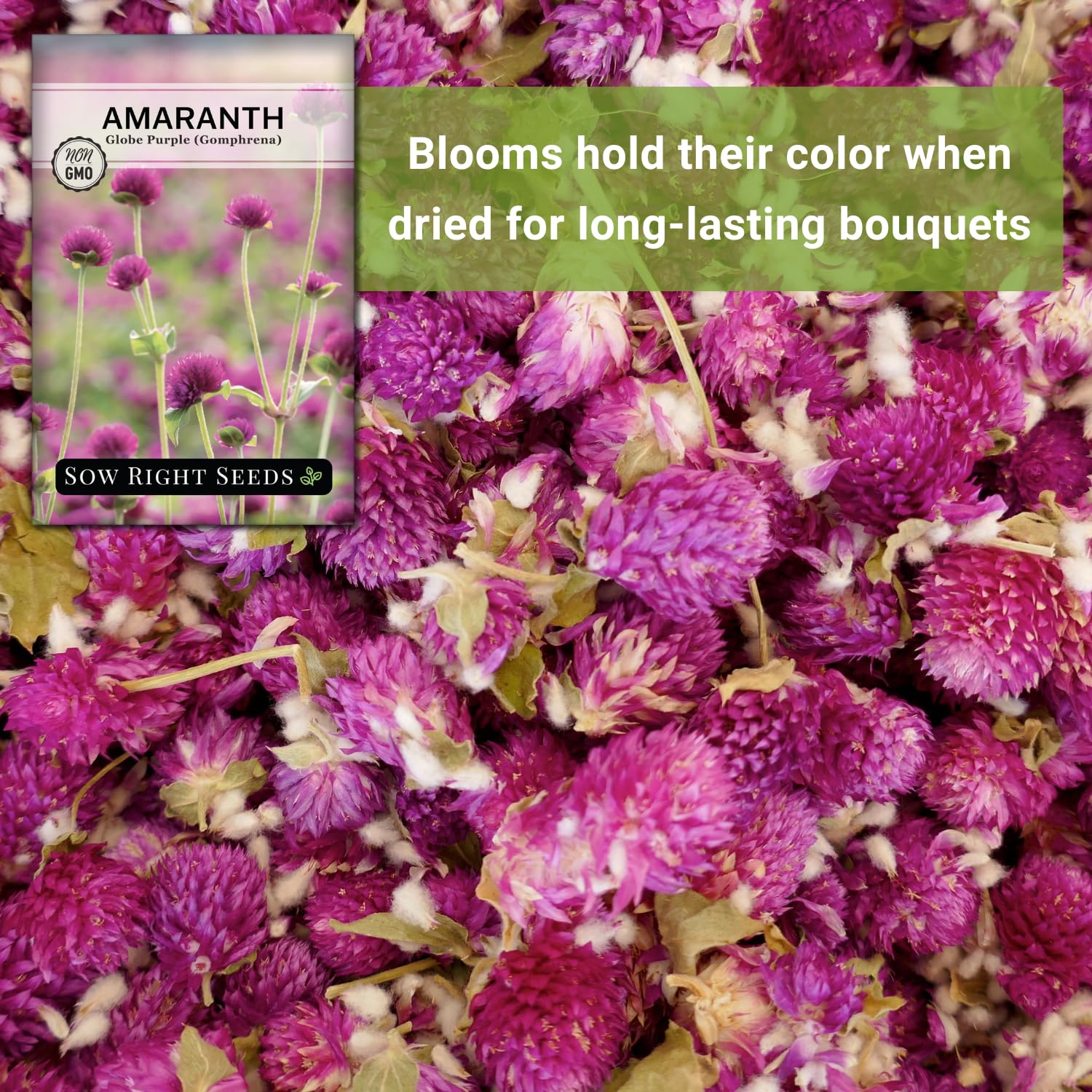 Beautiful - Large premium packet of Purple Globe Amaranth (Gomphrena globosa) seed. Globe Amaranth is a low-maintenance choice that withstands heat and drought well. The bushy plant produces masses of purple flower bracts all summer long. Blooms will hold their color when dried for everlasting bouquets. Minimum of 500 mg per packet (about 225 seeds).