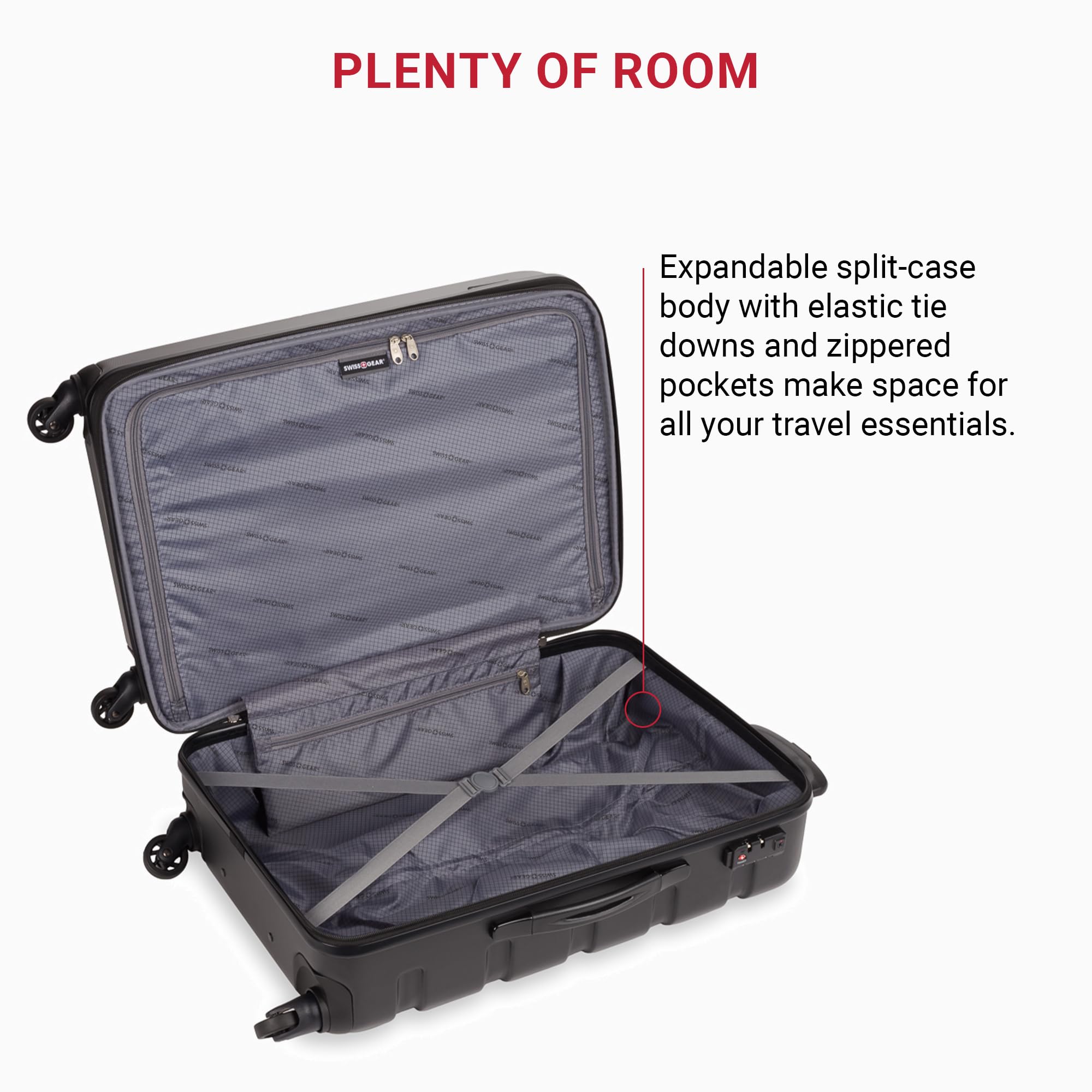 Description SwissGear 7366 Hardside Expandable Luggage with Spinner Wheels is the perfect bag for your next trip. This 23-inch suitcase is made of durable ABS and includes co-molded lift handle(s) with soft rubber hand grips for easy maneuverability. The split-case design expands 2" for additional packing space and a variety of internal pockets keep you organized. The eight 360-degree multi-directional spinner wheels and a premium, push-button steel locking telescopic handle make it easy to navigate through the airport. With outside dimensions of 26.25 x 18 x 11.25 inches including wheels and handles, this suitcase offers 23 x 16.75 x 11.25 inches of packing space. This hardside luggage is perfect for those who need a lightweight and durable suitcase for their travels. The hardshell exterior is designed to protect your belongings from the wear and tear of travel, while the spinner wheels make it easy to move around. The telescopic handle is designed to be comfortable and easy to use, and the internal pockets help you stay organized. Plus, this suitcase comes with a 10 year warranty against defects in materials and workmanship.