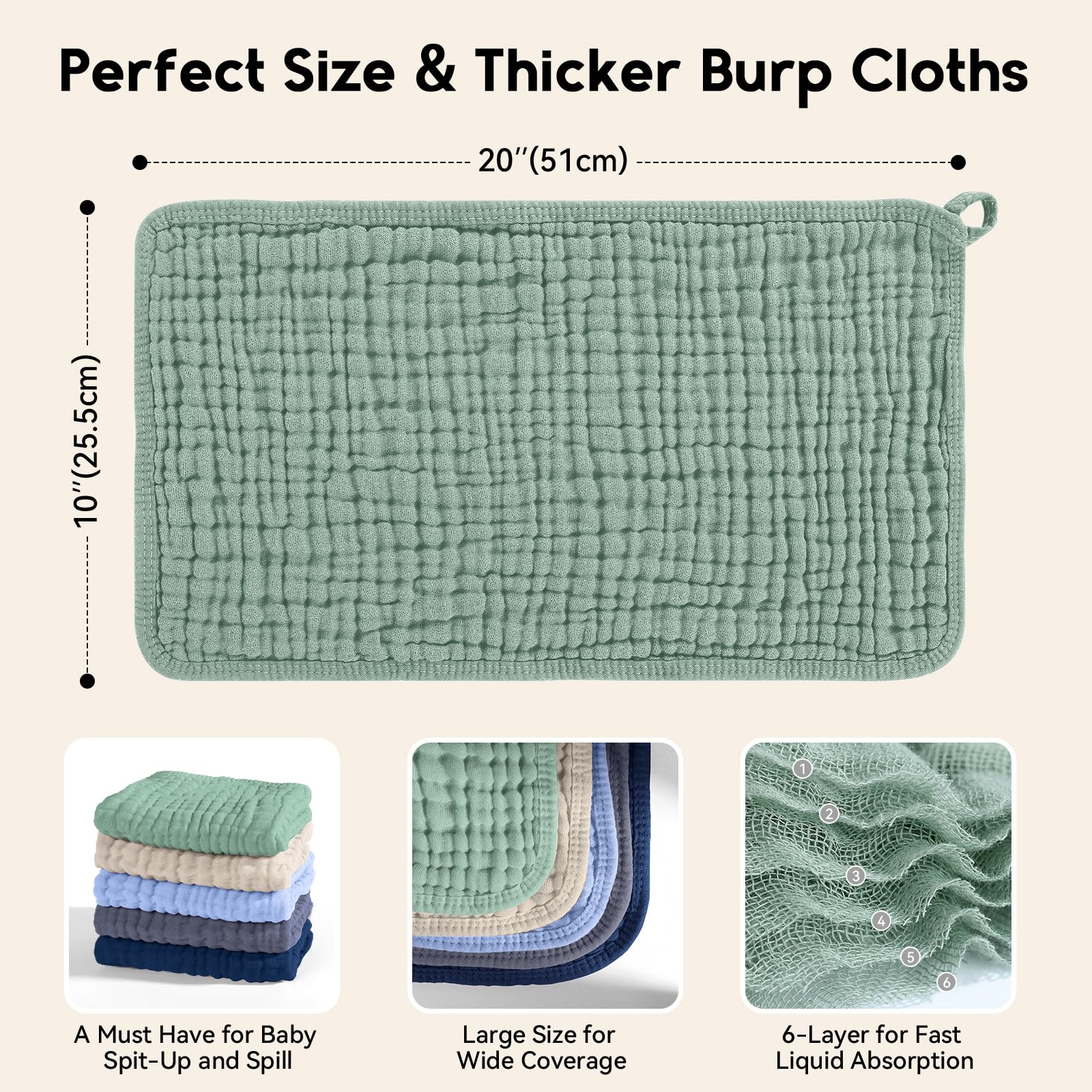Excellent Absorbent: Featuring 6 layers of absorbent muslin and fluffy structure design, our burping cloths for babies provide maximum absorption with tendor touch, works well to protect your teething baby from all dribble and spit ups soaking their clothes. Large 20''X10'' size provides maximum coverage and extra layering adds durability, making them ideal for use in any season.
