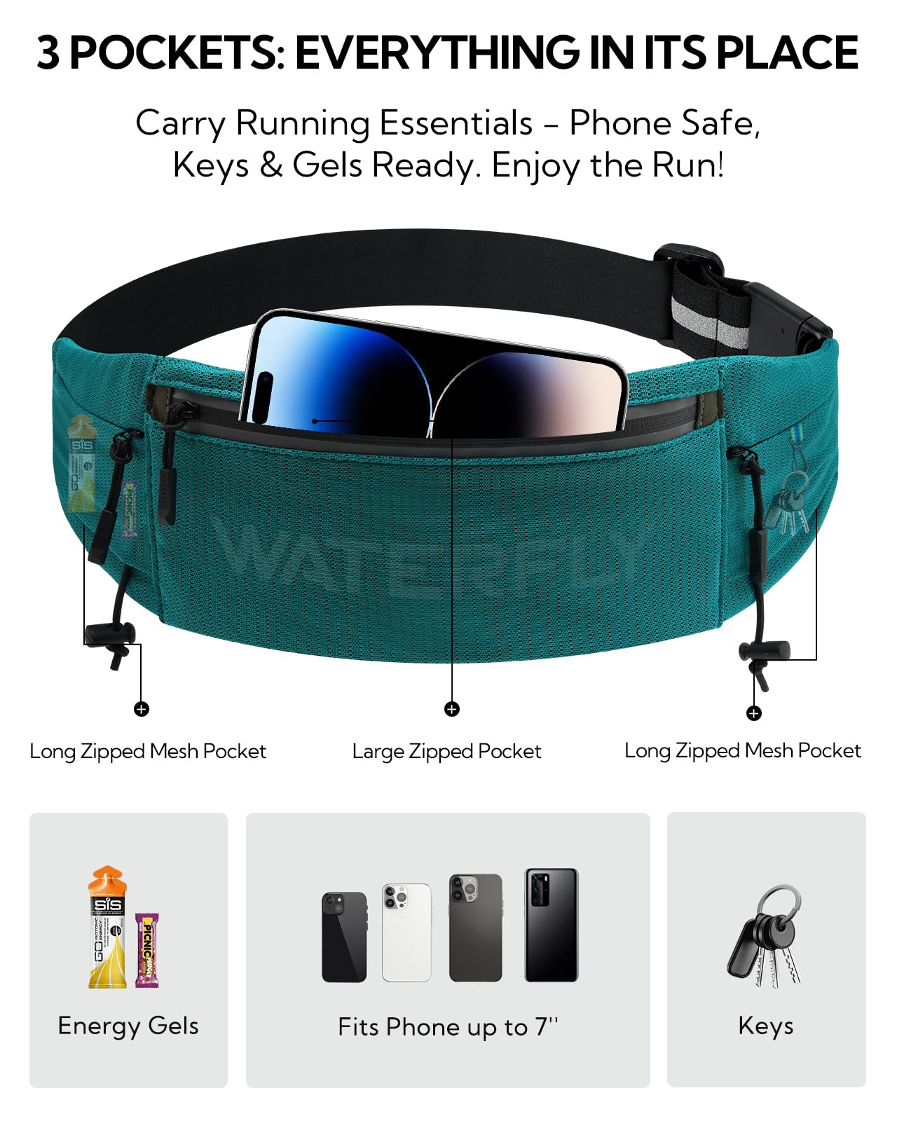 Multiple Pockets for Easy Organization: With 3 pockets, this running bag helps you store items orderly. Water resistant phone pocket fits phones up to 7". Two side zippered mesh pockets securely hold earphones, energy gels, tissues, and keys. Never lose your essentials again!