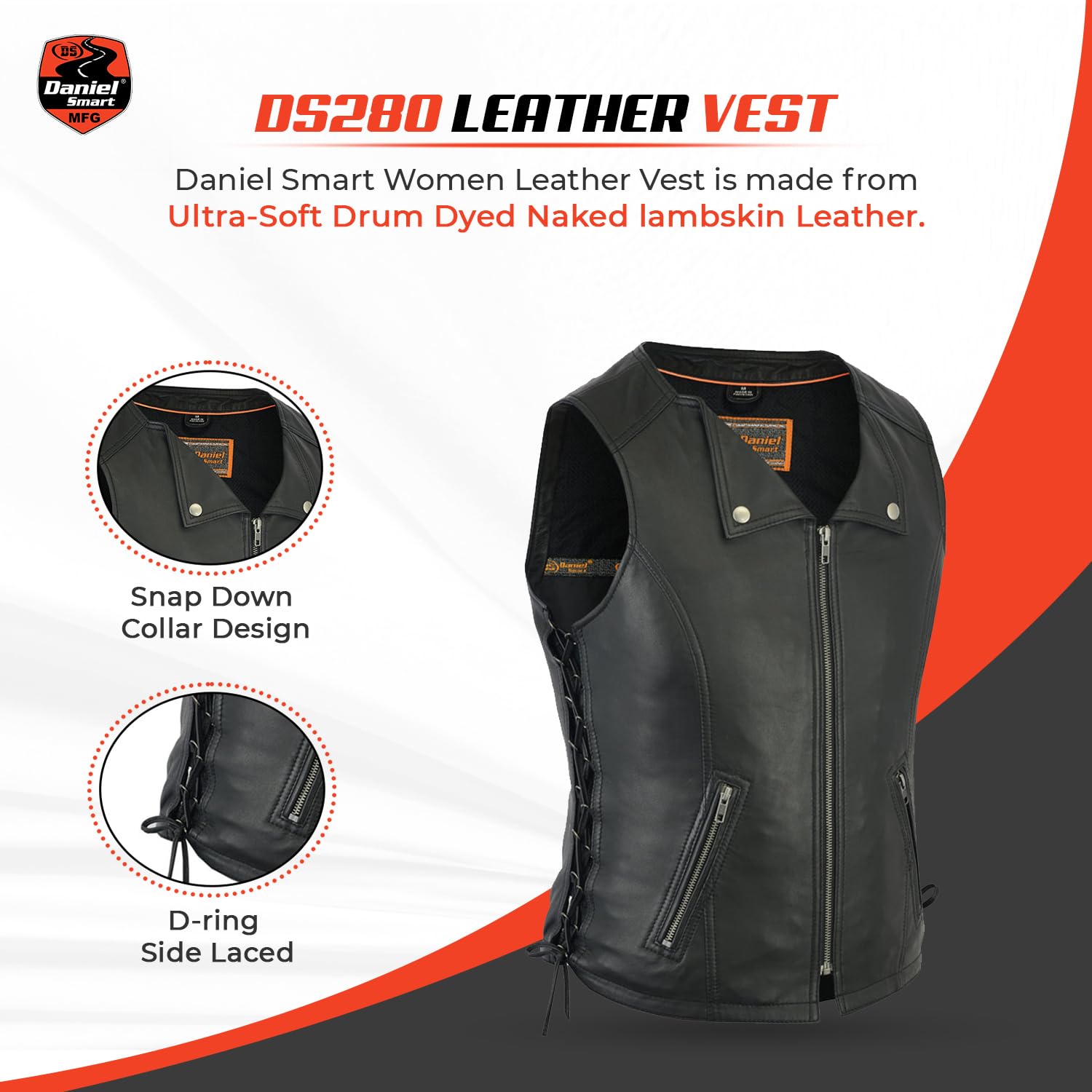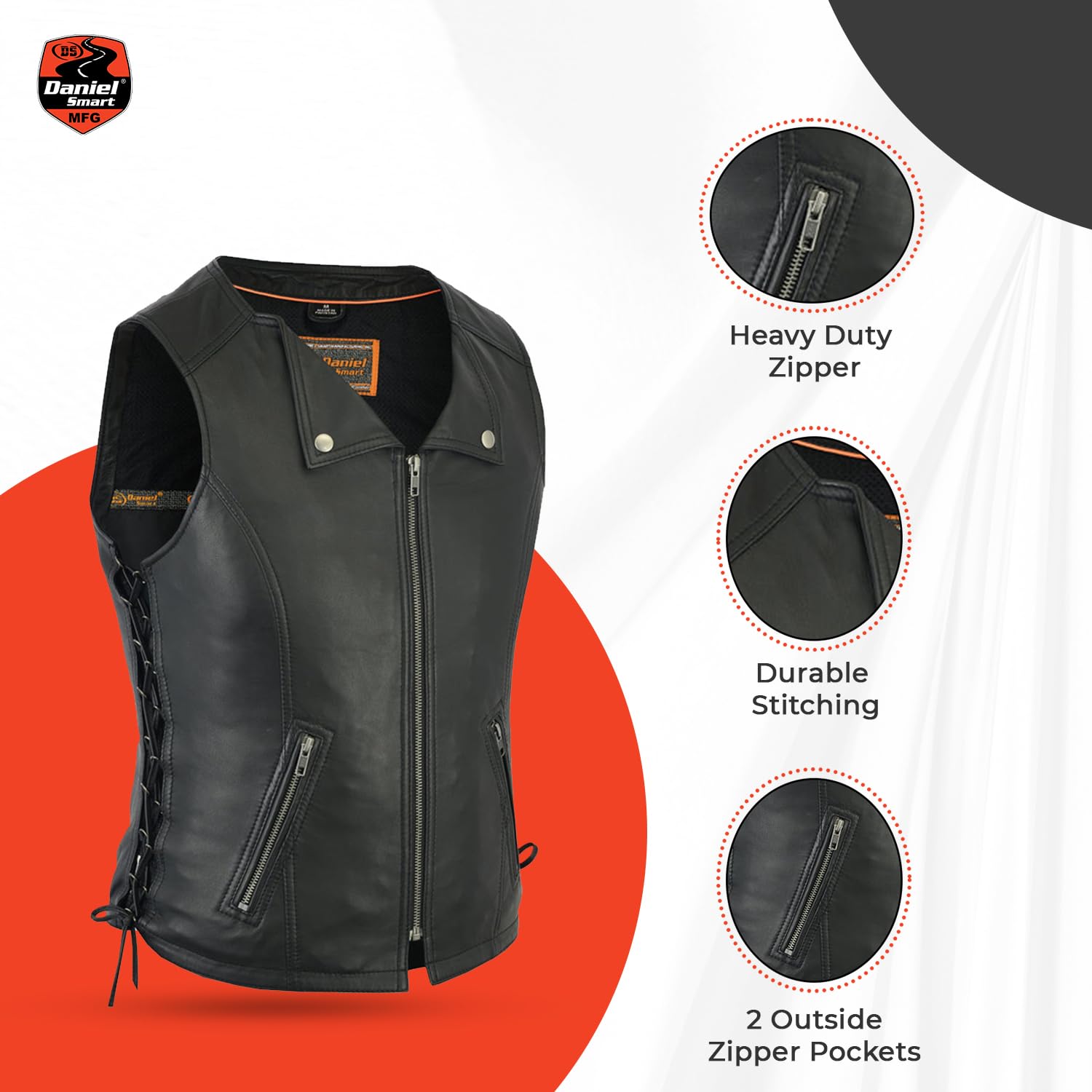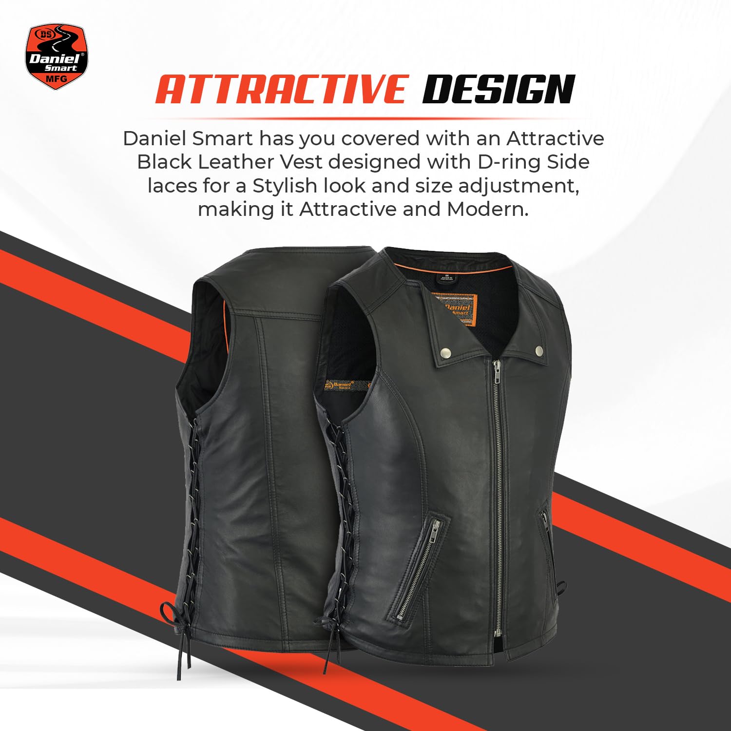 Premium Quality leather: Daniel Smart Women Leather Vest is made from Ultra-Soft Drum Dyed Naked lambskin with Heavy duty zippers which is an Attractive biker look for Ladies in Women Motorcycle Vest.