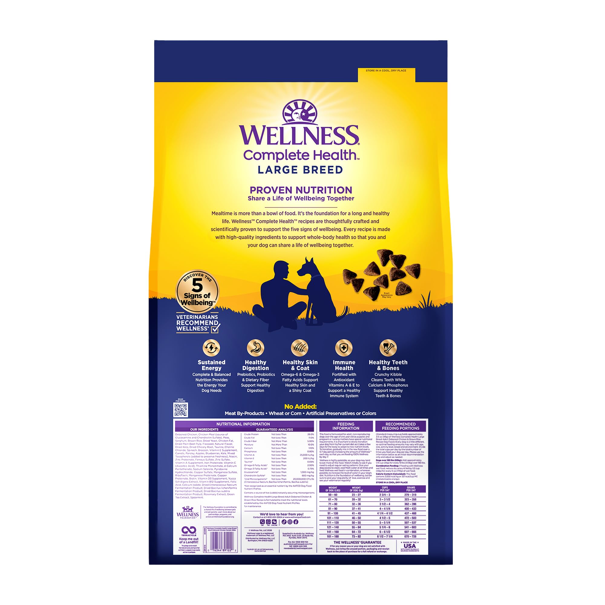 Wellness Complete Health Dry Dog Food, Large Breed Health Recipe, is healthy dog food for large breed dogs made with carefully chosen, authentic ingredients for everyday health and provide an optimal balance of nutrient-rich whole foods to fulfill the unique health needs of your larger dog, providing whole-body nutritional support to promote complete health. Wellness Complete Health Dry Dog Food supports your dog's balanced nutrition, healthy body mass, overall health and vitality, optimal nutrient absorption, bone and joint health and digestive health, all with delicious ingredients to provide a guaranteed great taste that dogs love.
