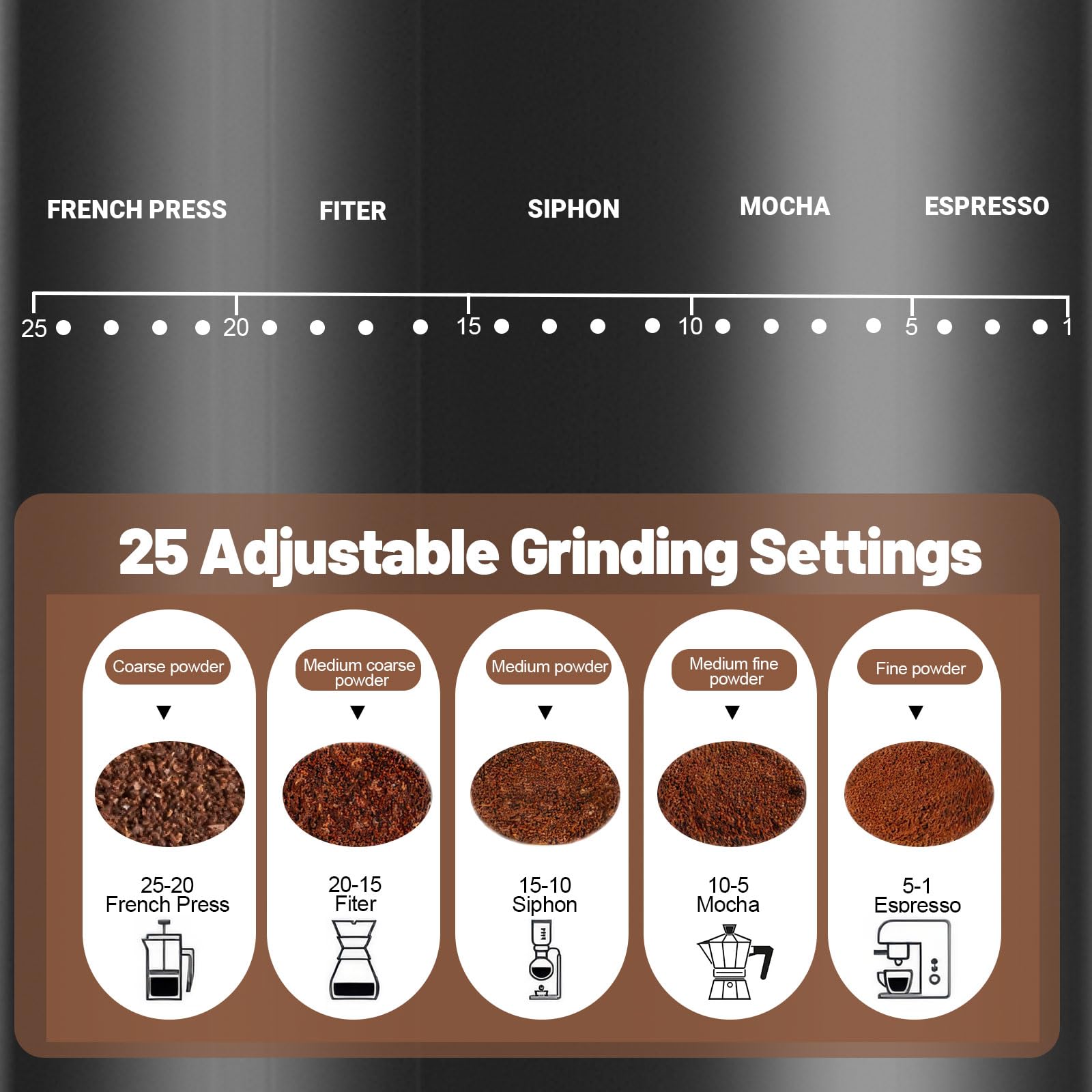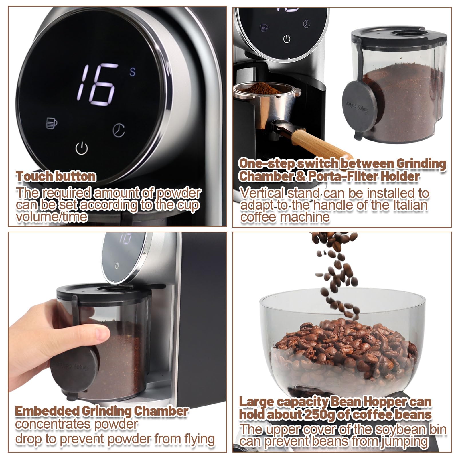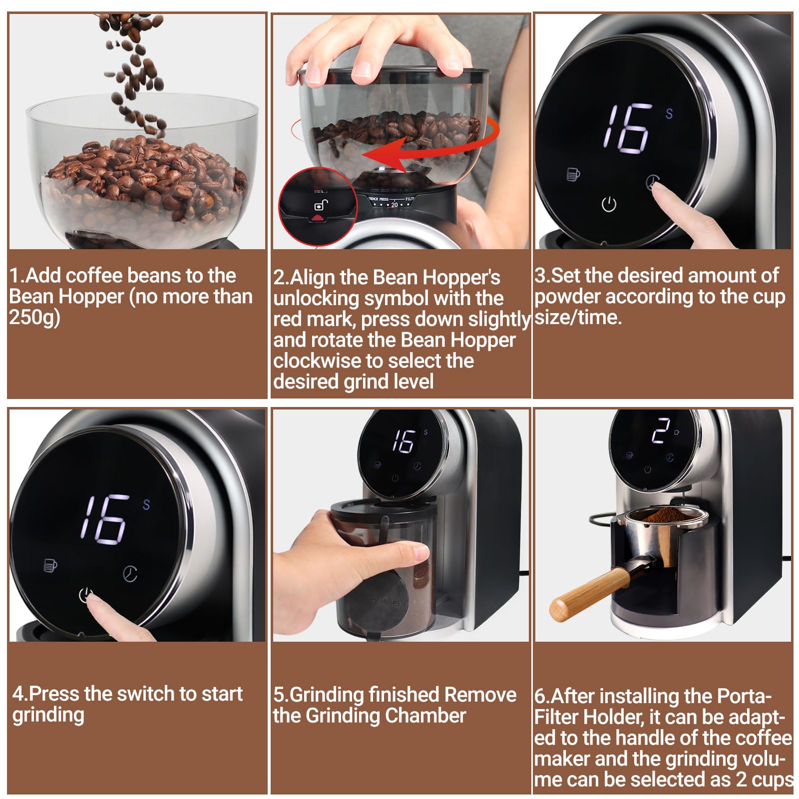 Effortless Electric Operation:Say goodbye to the laborious task of manual grinding. Our electric coffee grinder takes all the effort out of the process. With just a simple touch on the screen, it starts grinding the coffee beans quickly and efficiently. This electric operation is not only convenient but also ensures consistent results every time you use it(110V)