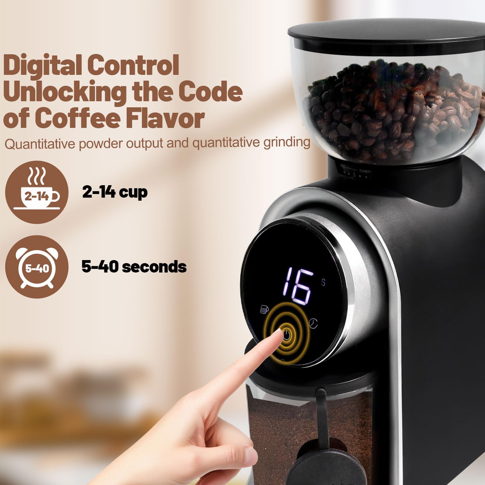 Touchscreen Control:Our electric coffee bean grinder is equipped with a touch screen to make the grinding process easy and simple. You can easily set the coarseness and portion of ground coffee to your liking. It can grind enough for up to 14 cups of coffee at a time, so whether you're enjoying some alone time at home or hosting a small gathering, this grinder is perfectly suited to your needs