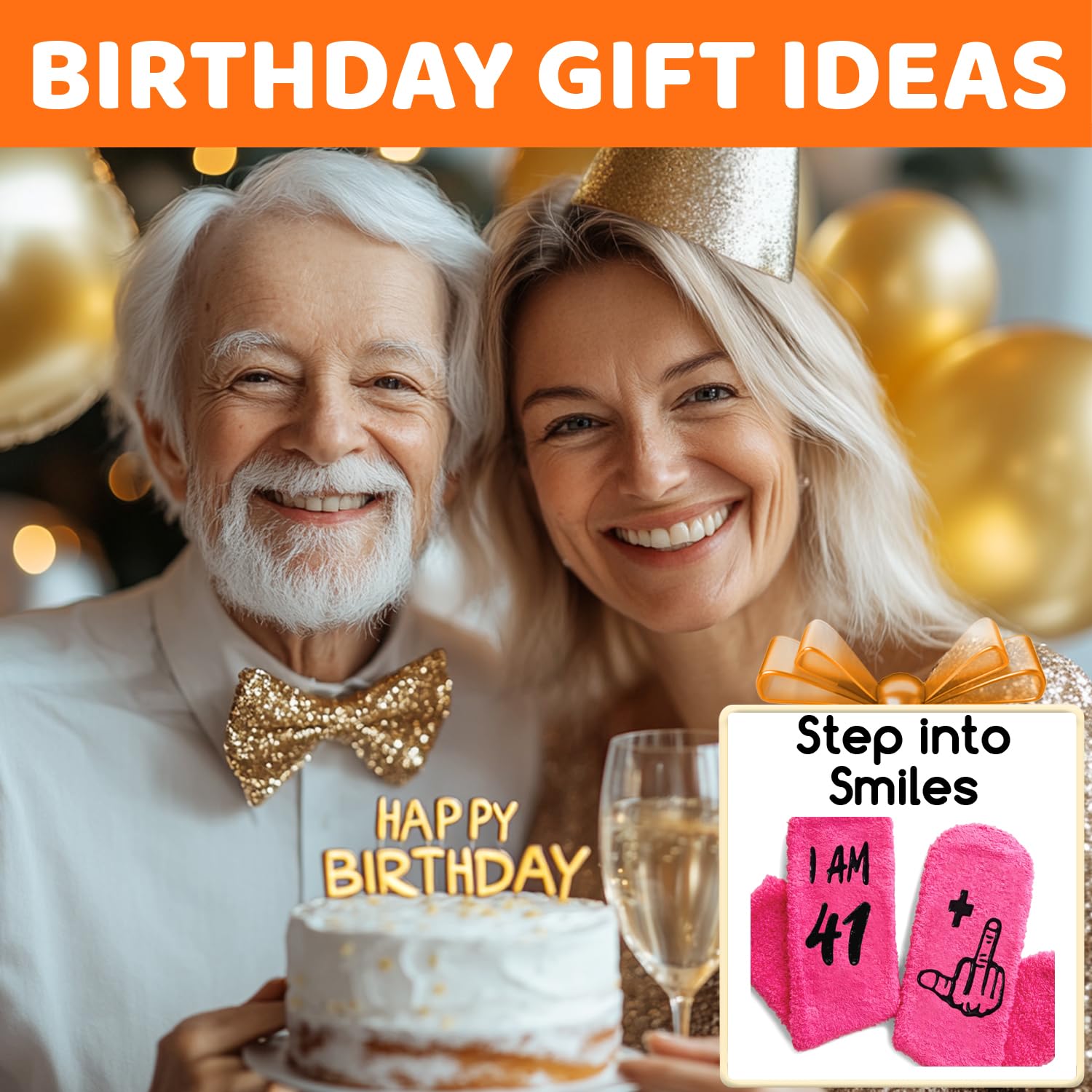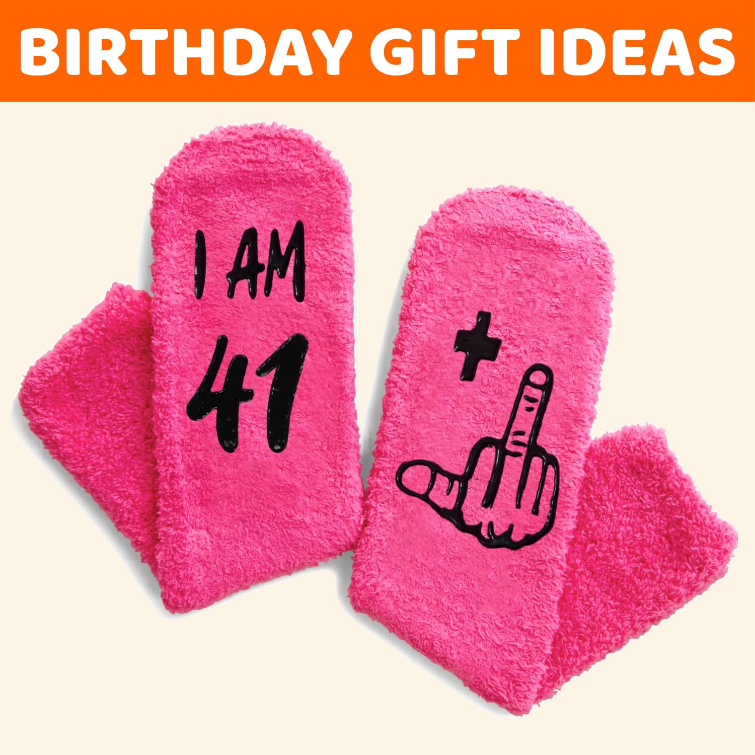 42ND BIRTHDAY GIFT IDEAS: Celebrate her shining moment with our birthday socks. These pink socks with the phrase "I AM 41 +1" make a fun and thoughtful gift!