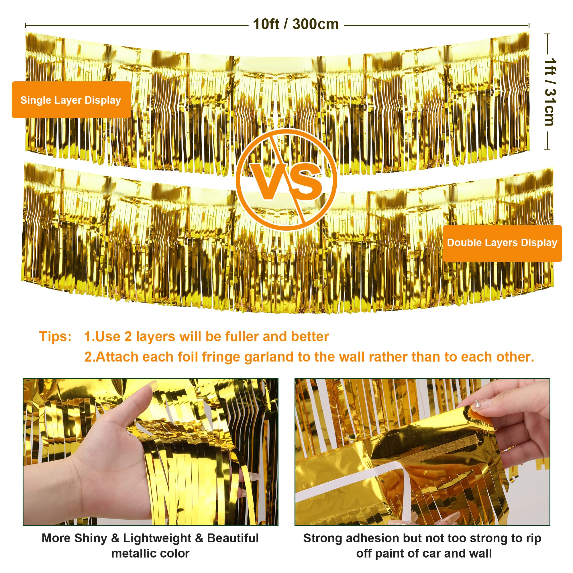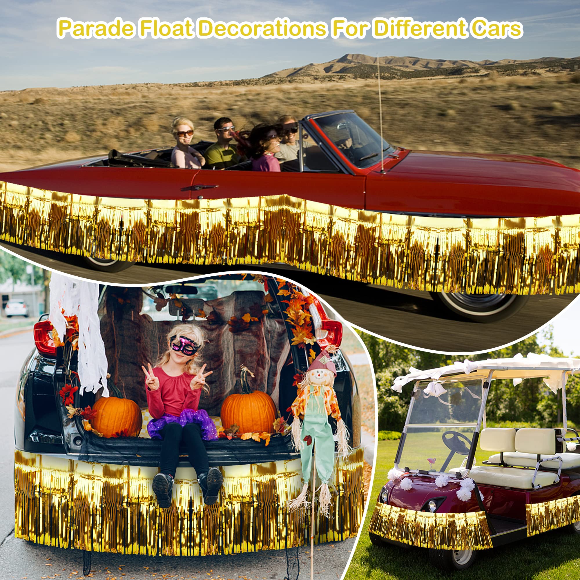 【PACKAGE INCLUDES】Comes with 4 packs of Gold foil, 10*1 ft/3*0.3m (L*W ), You can cut it into any size to meet your decoration needs. If you want parade float decoration to be colorful, fuller, thicker and looks better, it is better to use more than 2 packs of fringe float overlapping together. And tape each foil fringe garland on the car/wall, not on top of each other. With these festive metallic streamers, you can take your parade float decorations to the next level.