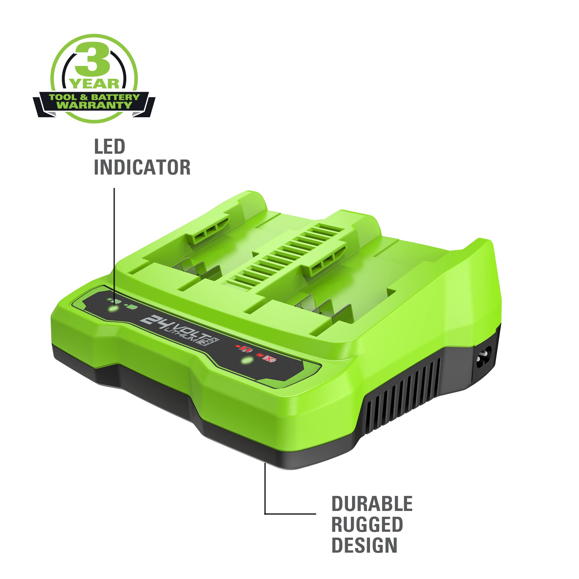 Starter kit includes (2) 4.0Ah USB batteries and dual port rapid charger to power any Greenworks 24V or 48V (2 x 24V) product