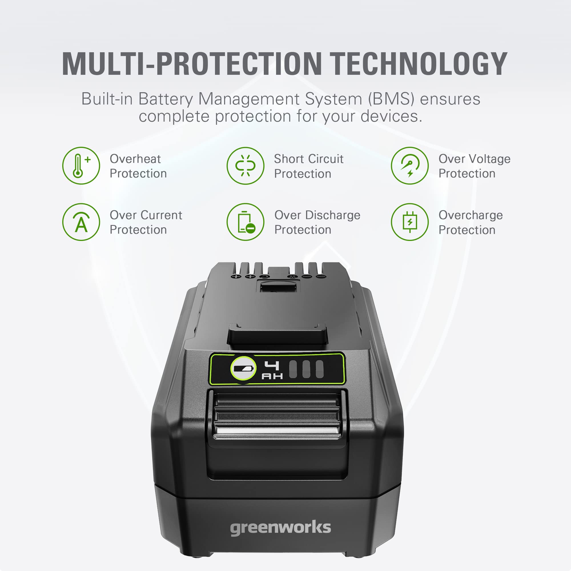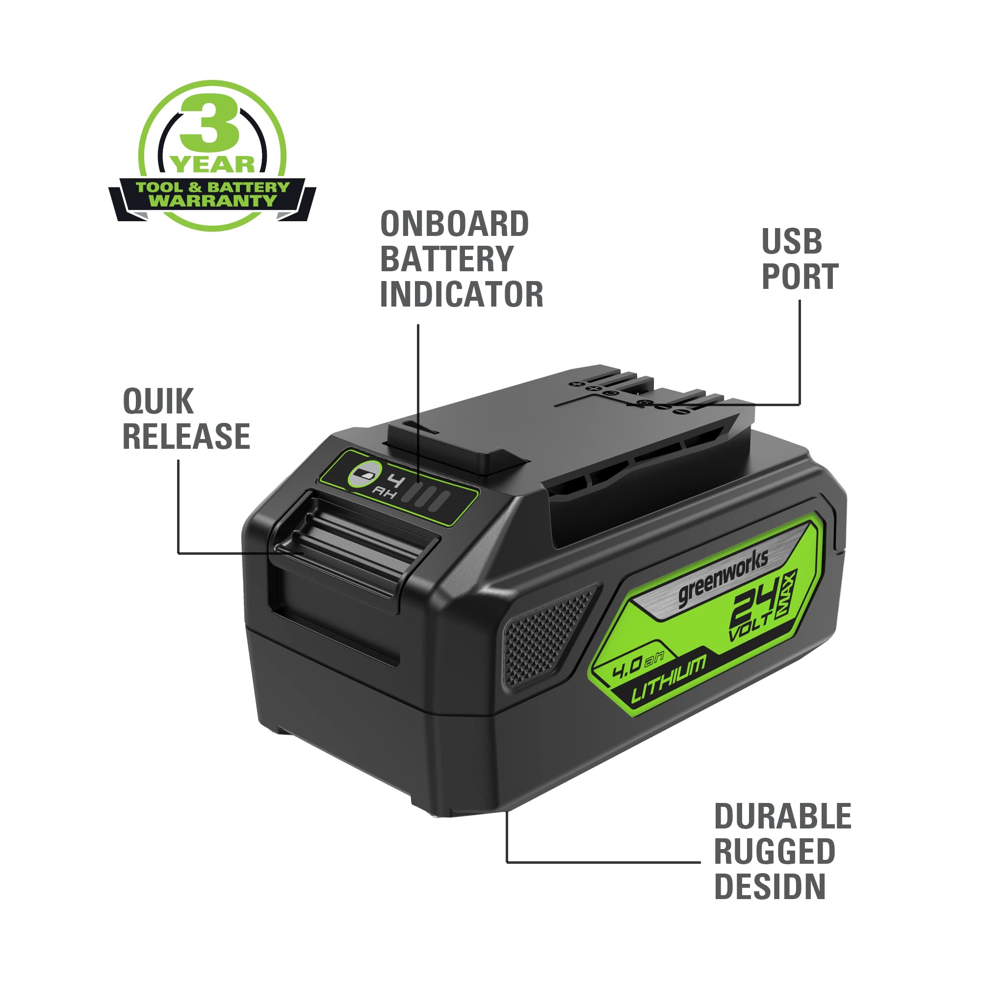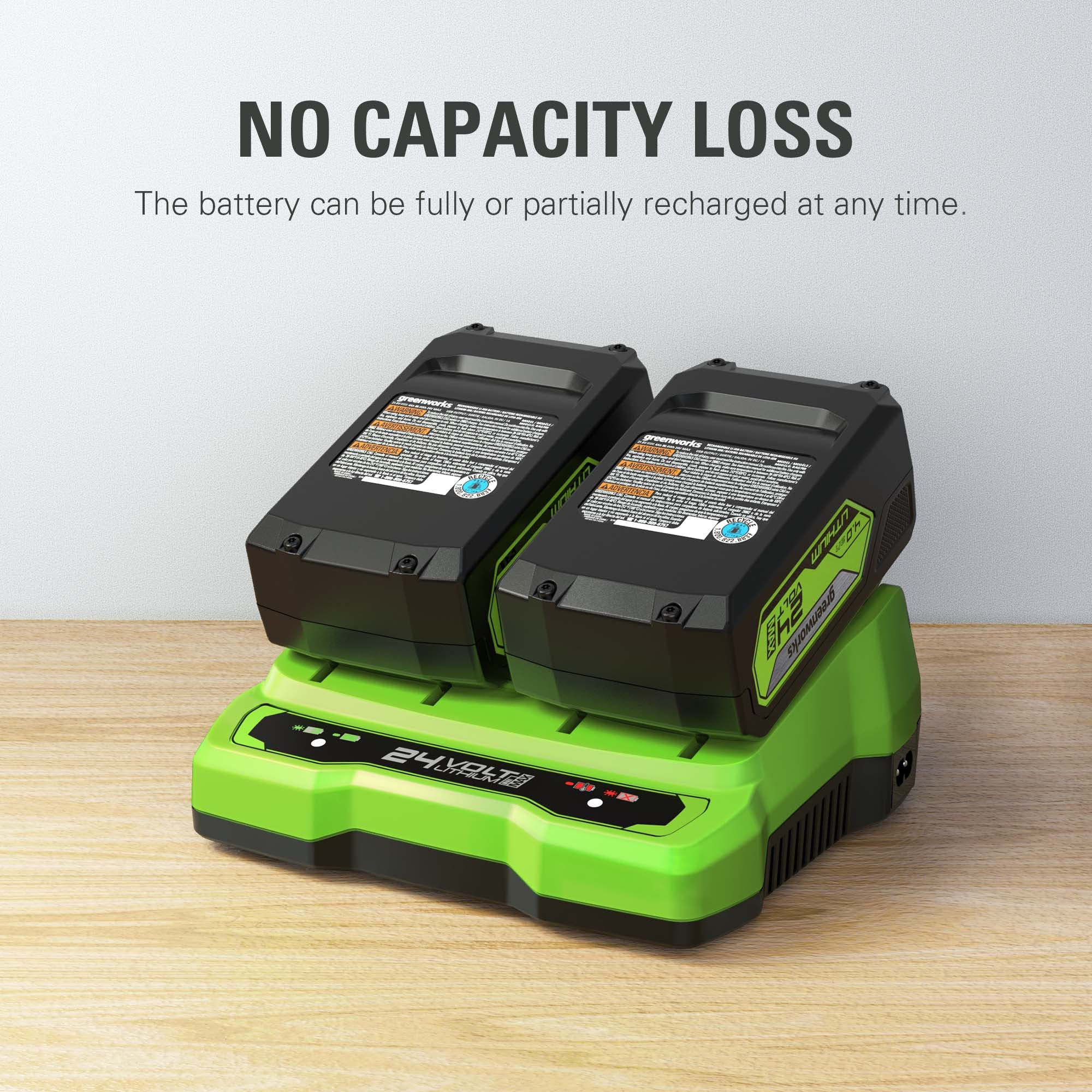 Greenworks 24V 4Ah (96Wh Max) lithium-ion battery delivers fade-free power with no memory loss after charging