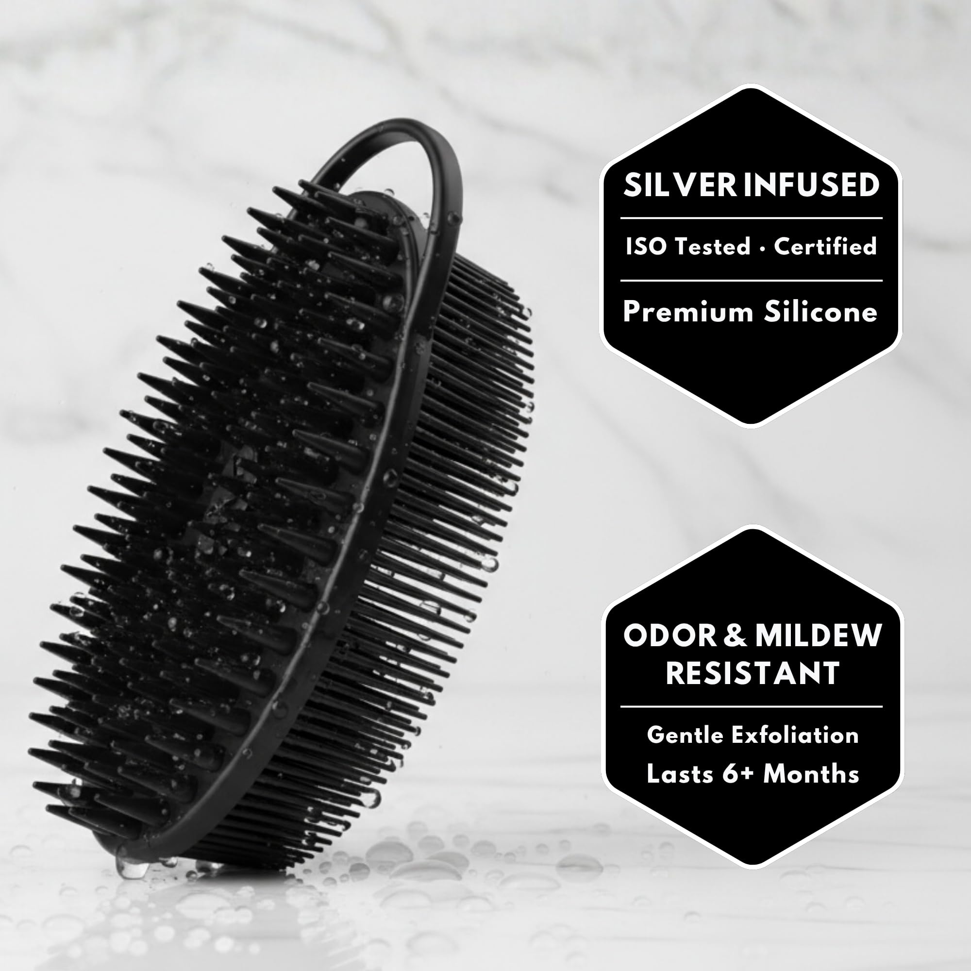 ā ENHANCED SHAMPOO DISTRIBUTION - Creates rich lather with less product needed. Silver-infused material ensures even coverage reaching all areas of scalp. Helps remove styling product residue effectively. Premium hair care tool