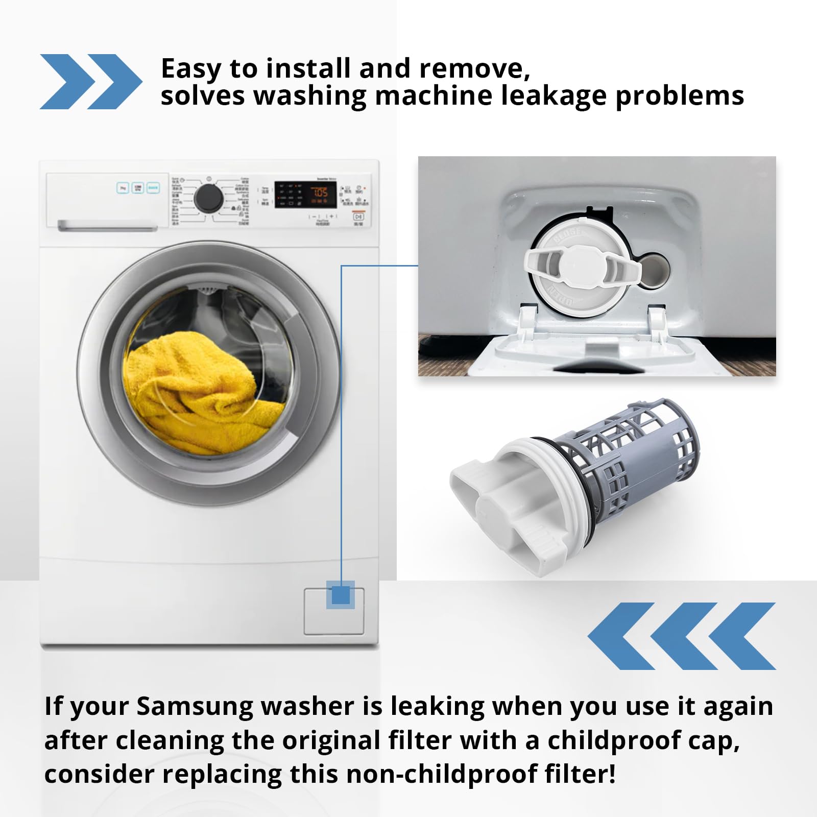 If your Samsung washer is leaking when you use it again after cleaning the original filter with a childproof cap, consider replacing this non-childproof filter! Avoiding flooding in your home.