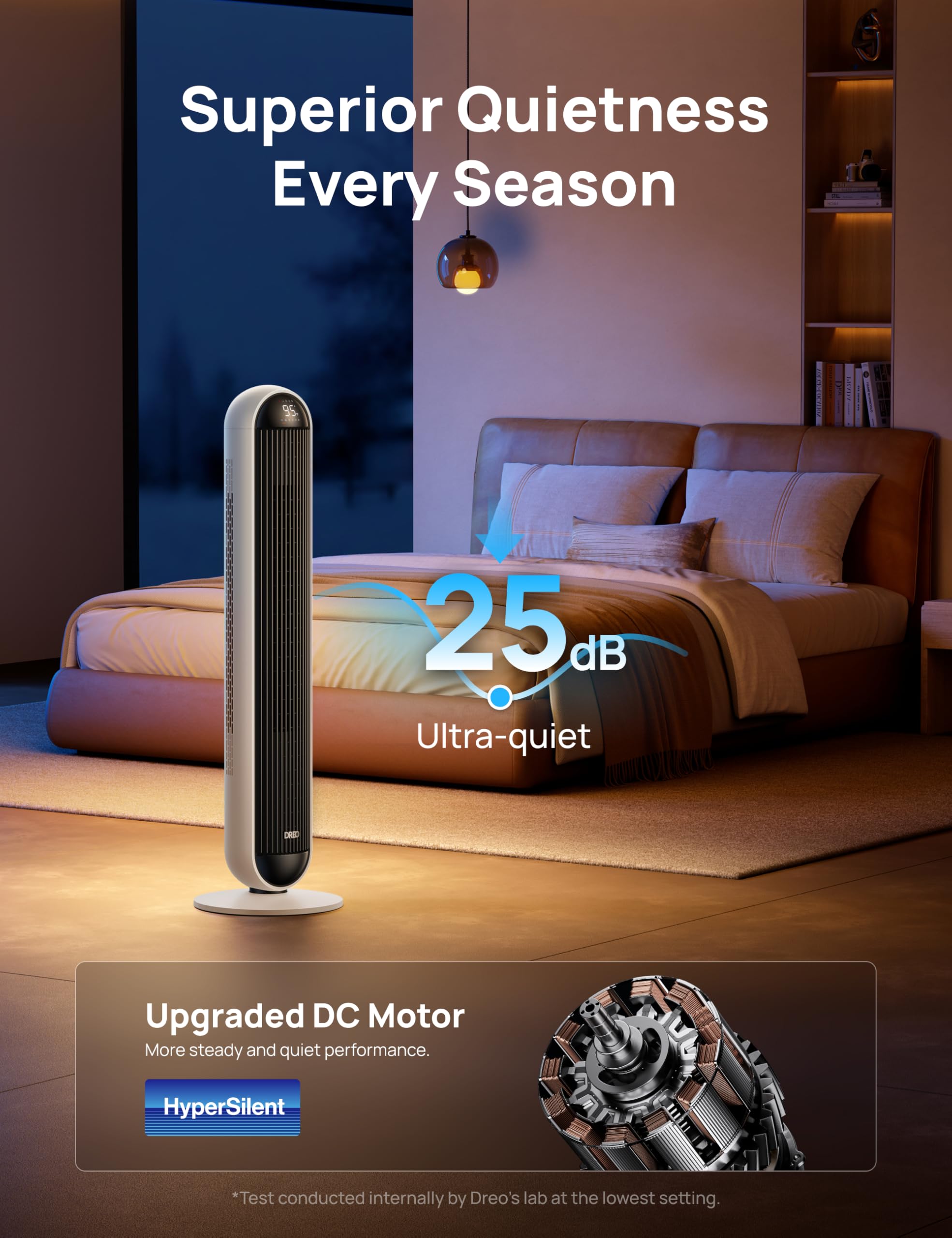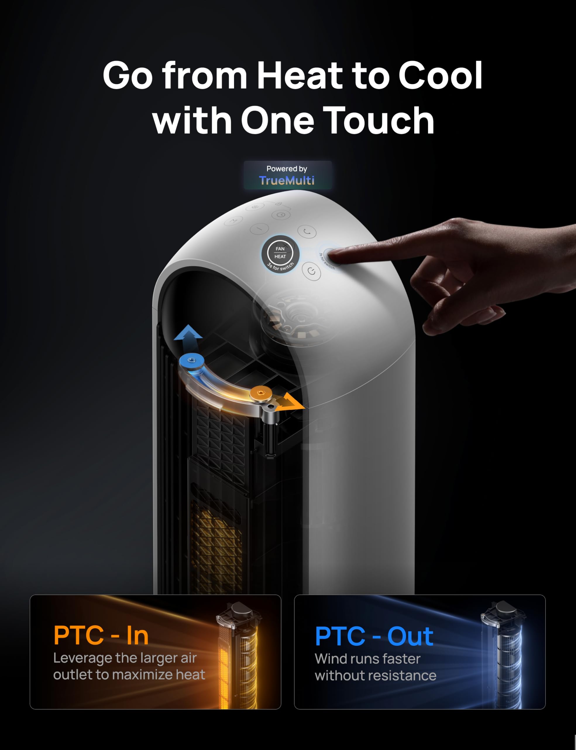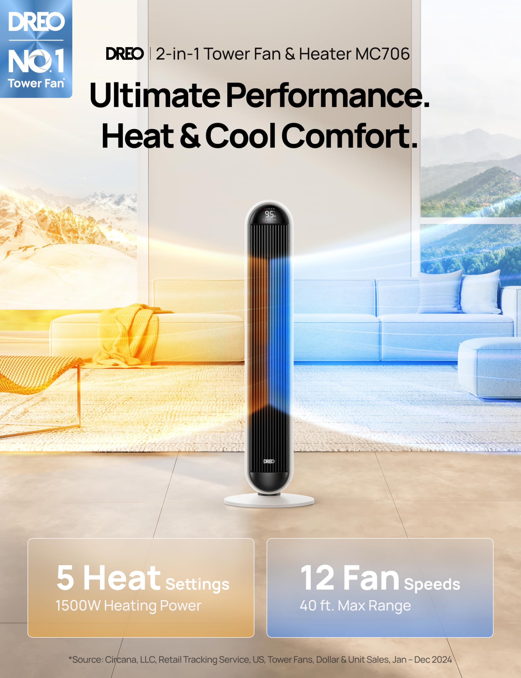 The Ultimate Fan & Heater: the DREO MC706 integrates an auto-shift tech that lets you go from a 5-level 1500W PTC room heater in winter to 12 cooling fan speeds in summer, making this 42 inches 2-in-1 heater for bedroom a great option for all-season use