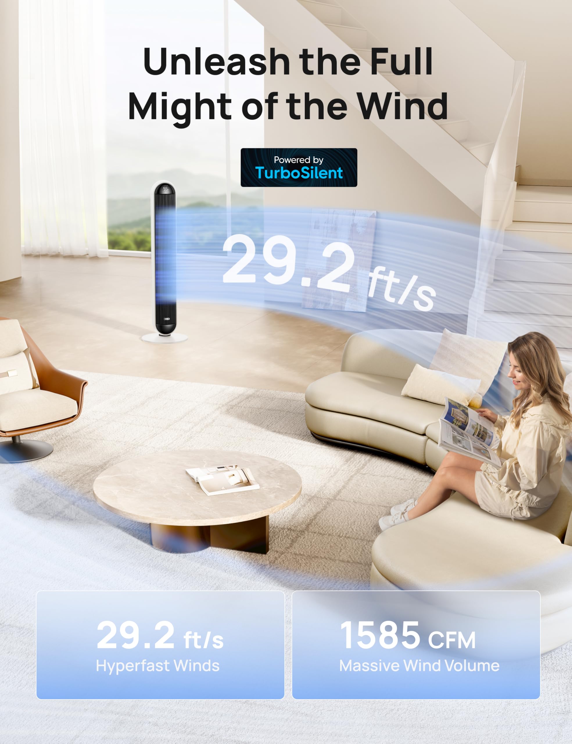 Wind Speeds Faster Than Ever: The 1800 RPM upgraded DC motor delivers an extra boost in performance, blowing 1585 CFM of air volume up to 40 ft away, together with its ultrawide 120˚ oscillation, you can bring cool wind and warmth wherever you need
