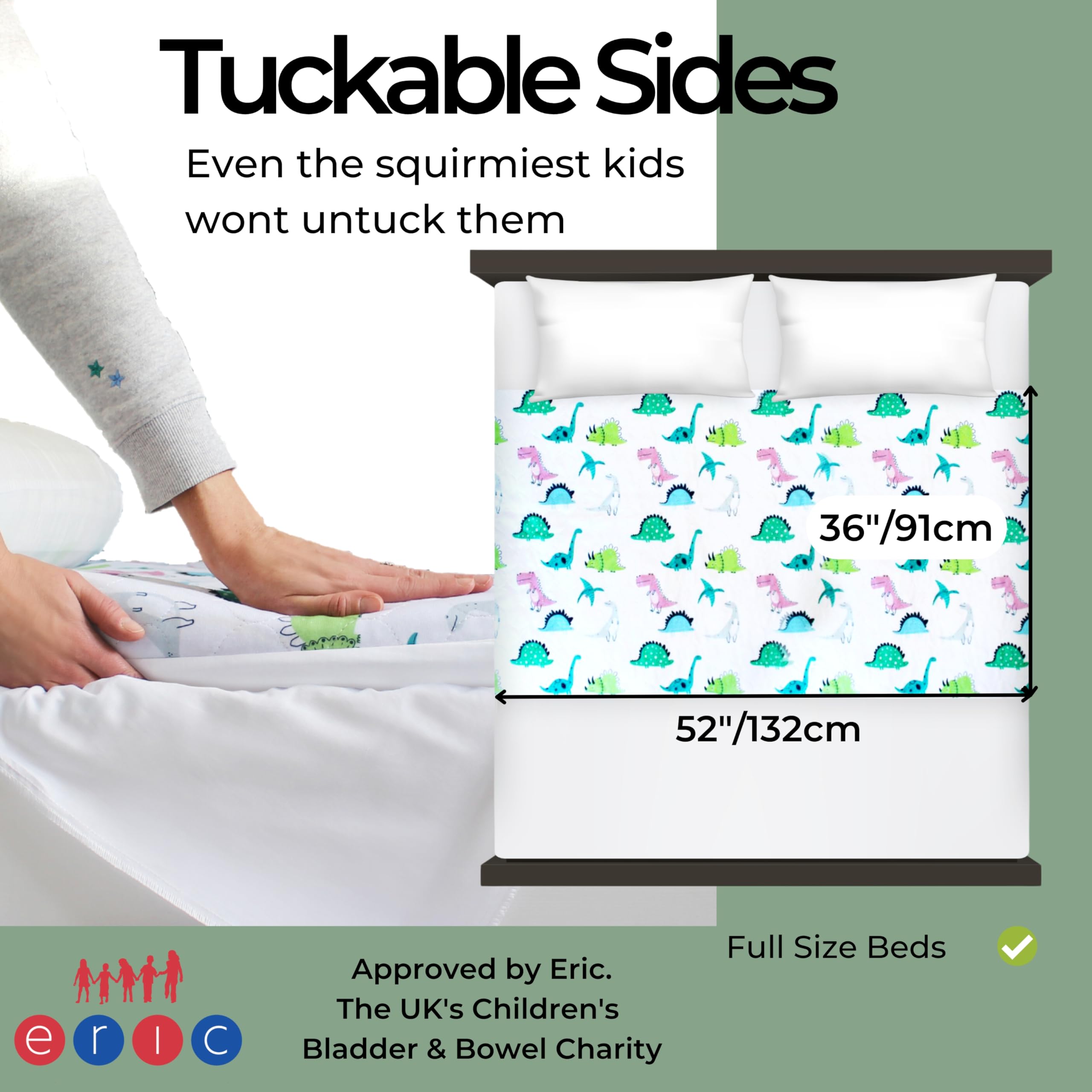 🦕 DOESN'T MOVE IN THE NIGHT - Many bed wetting pads for kids leak as they don't have tucks which hold the potty training mattress protector in place. And let’s face it - kids can be wriggly at night. The tucks wrap around either side of the mattress ensuring it doesn't move.