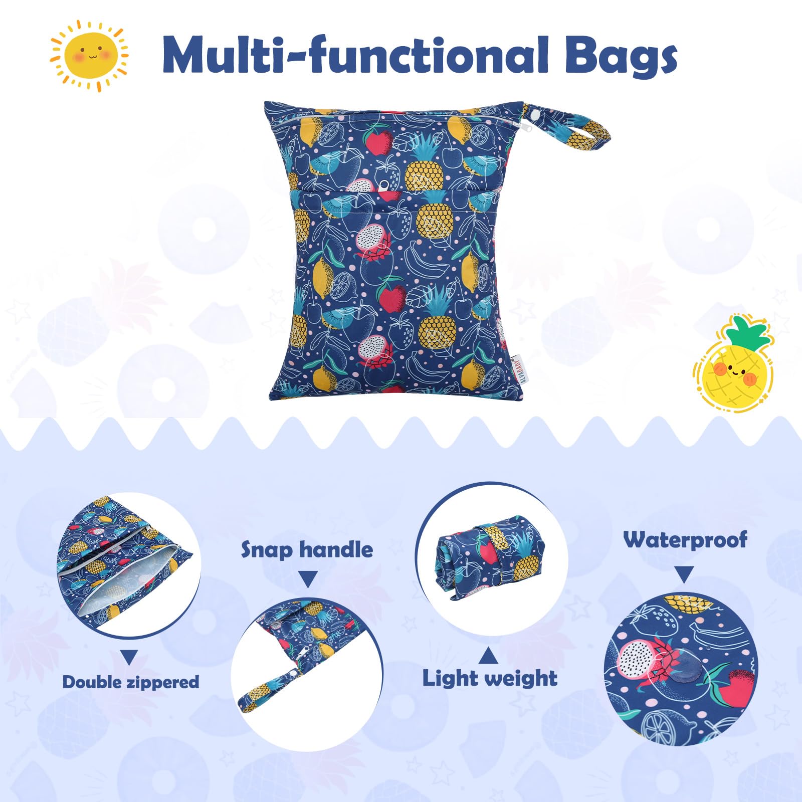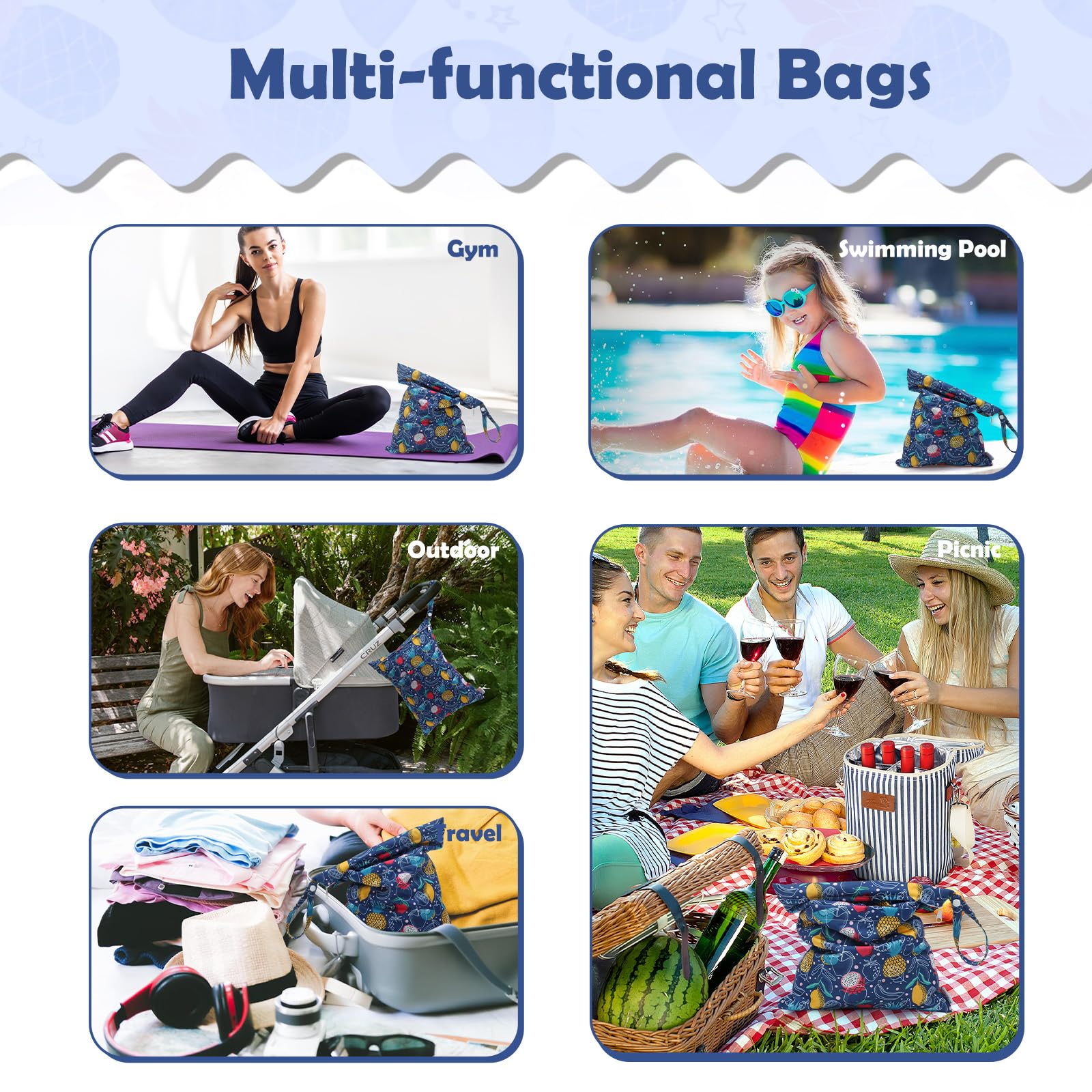 Multi-functional Bags-A truly wonderful bag that allows you to carry your wet and dry items in the same bag. Carry all your items in one bag while keeping your dry items dry and your wet or soiled items separate. Truly an all in one bag! They can be used as diaper wet dry bags,travel bags,storage bags,cosmetic bags,handbags,wash bag,organizer bags.