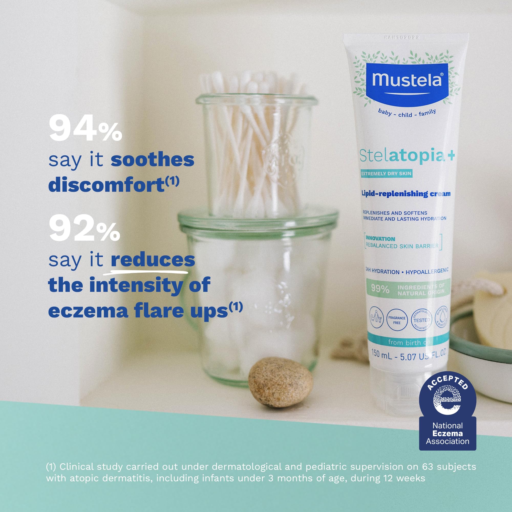 Soothes And Protects Extremely Dry to Eczema-Prone Skin. Mustela Stelatopia+ Lipid-Replenishing Cream immediately and continuously nourishes and moisturizes extremely dry to eczema-prone skin for up to 24 hours. Specifically designed for daily use, Stelatopia+ Lipid-Replenishing Cream strengthens and protects the skinβs moisture barrier and rebalances skin to prevent dryness. Stelatopia+ Lipid-Replenishing Creamβs comforting texture is easy to apply and absorbs into skin quickly, to soften dry and eczema-prone skin without leaving a sticky residue. Composed Of 99% Ingredients Of Natural Origin.